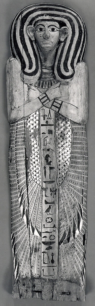 The folded wings that embrace the lower body of the deceased identify this as a variation on the rishi (feathered) coffin-type, dating the piece to the late 17th or early 18th Dynasty. The Hathor-style wig (long locks with an outward curl at the end) in blue and yellow stripes and the large ears evoke the style of the Middle Kingdom. In addition to the wig, the child wears a broad festival collar and cuff bracelets. The wings are green and white, with details picked out in black, white, and red. Her body is yellow (the color used for female skin), and the inscription down the center of her body asks that offerings be given to her by the king through the offices of the mortuary gods Ptah-Sokar and Osiris. Unfortunately, the extended foot is broken off just where the owner's name would have been written.