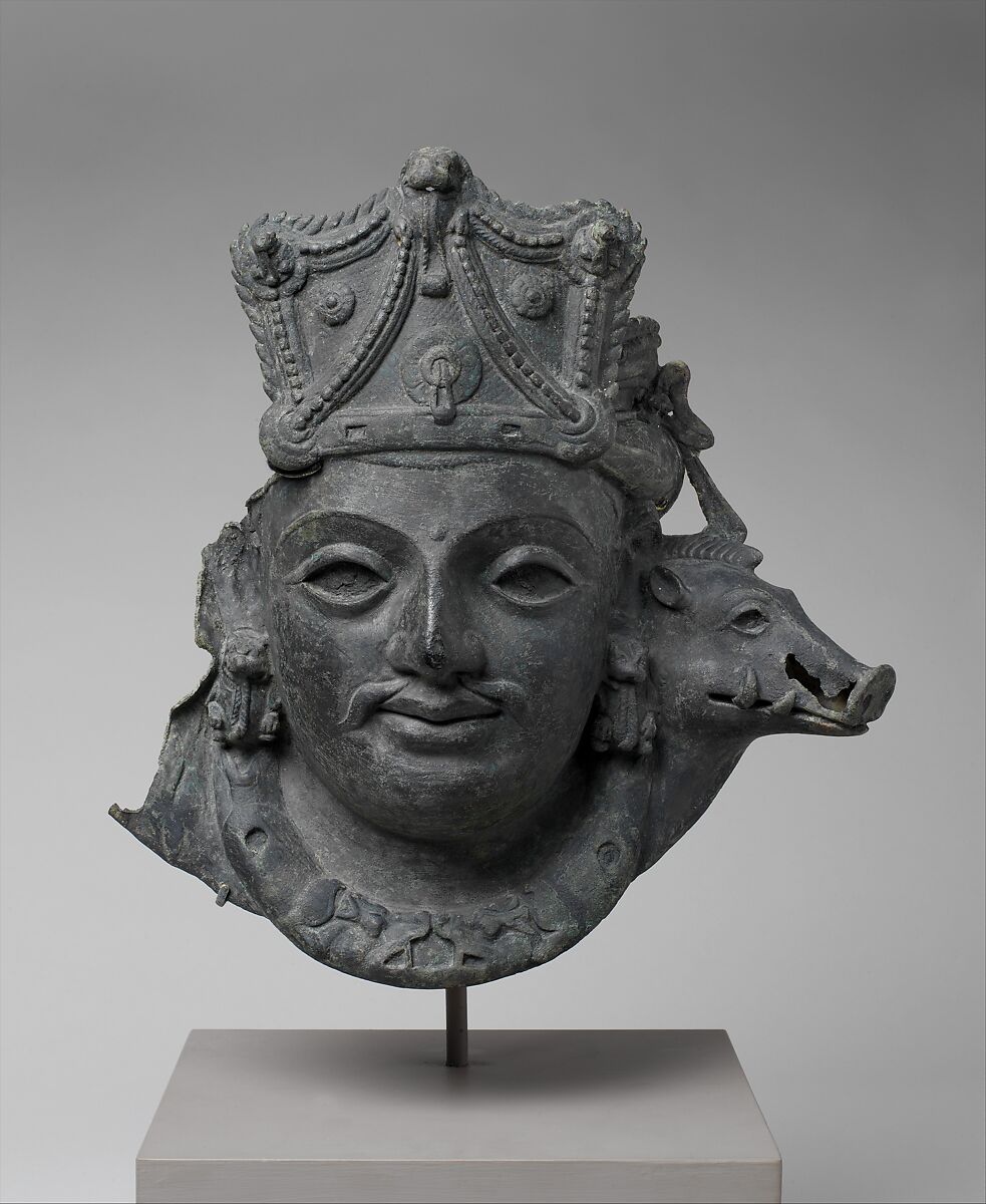 This early representation of Vishnu expresses the deity’s supreme manifestation, in which his two premier avatars, the boar Varaha and the man-lion Narasimha, are given expression in one form, the three-headed Para Vasudeva or Vaikuntha. Here, only the boar survives intact, framing the moustached and crowned Vishnu, who embodies an Indian vision of kingship. This remarkable bronze mask would have been secured to a wood frame, richly clothed, and garlanded to evoke the presence of Vishnu during temple festival parades, as is still seen today in the remoter regions of Himachal Pradesh in northern India.