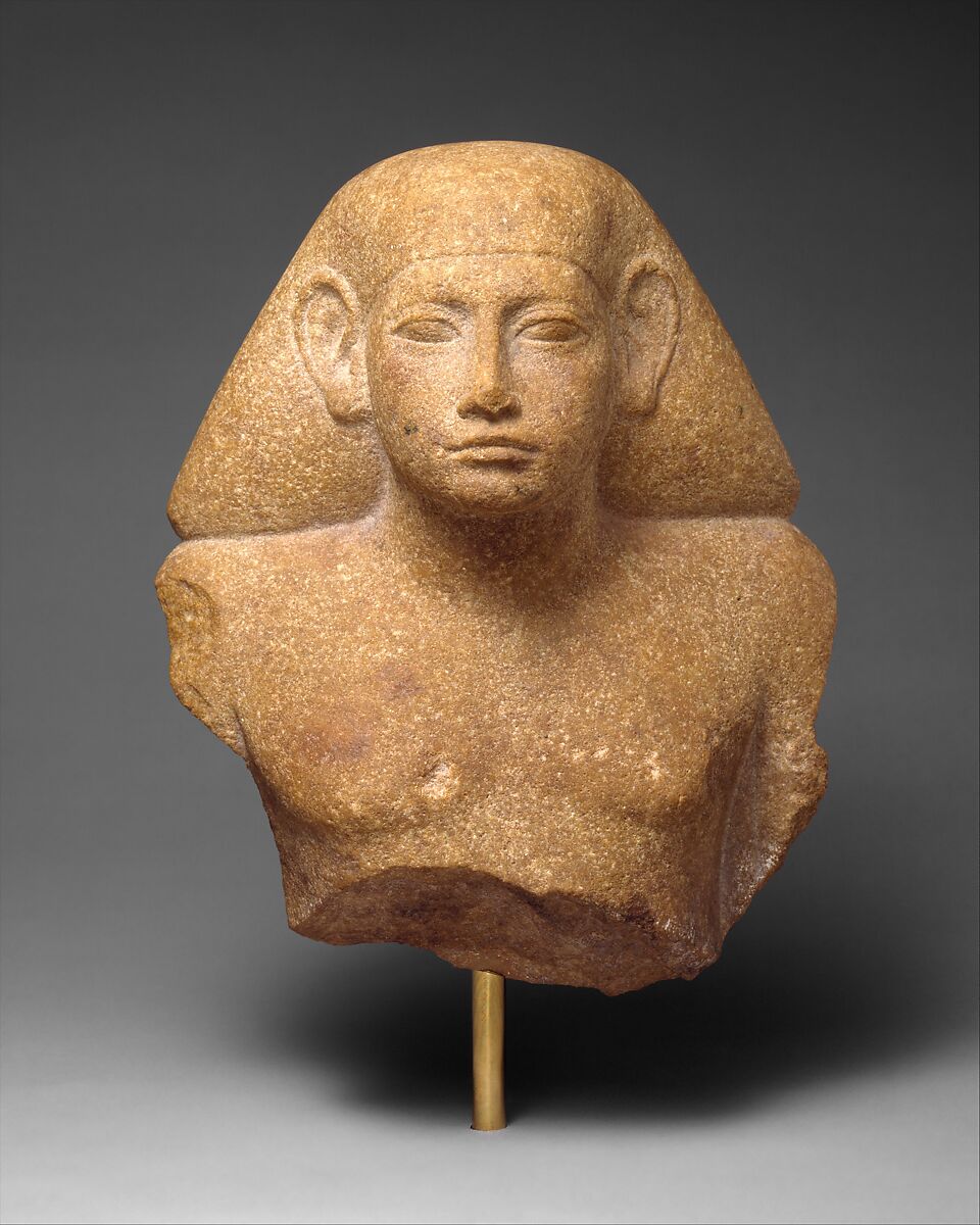 The large ears and hooded eyes of this exceptionally sensitive image are seen in many later Middle Kingdom representations, continuing the artistic tradition of 12th Dynasty royal portraits. The jutting mouth, small chin, and angularly defined breasts are known from Dynasty 13 works.