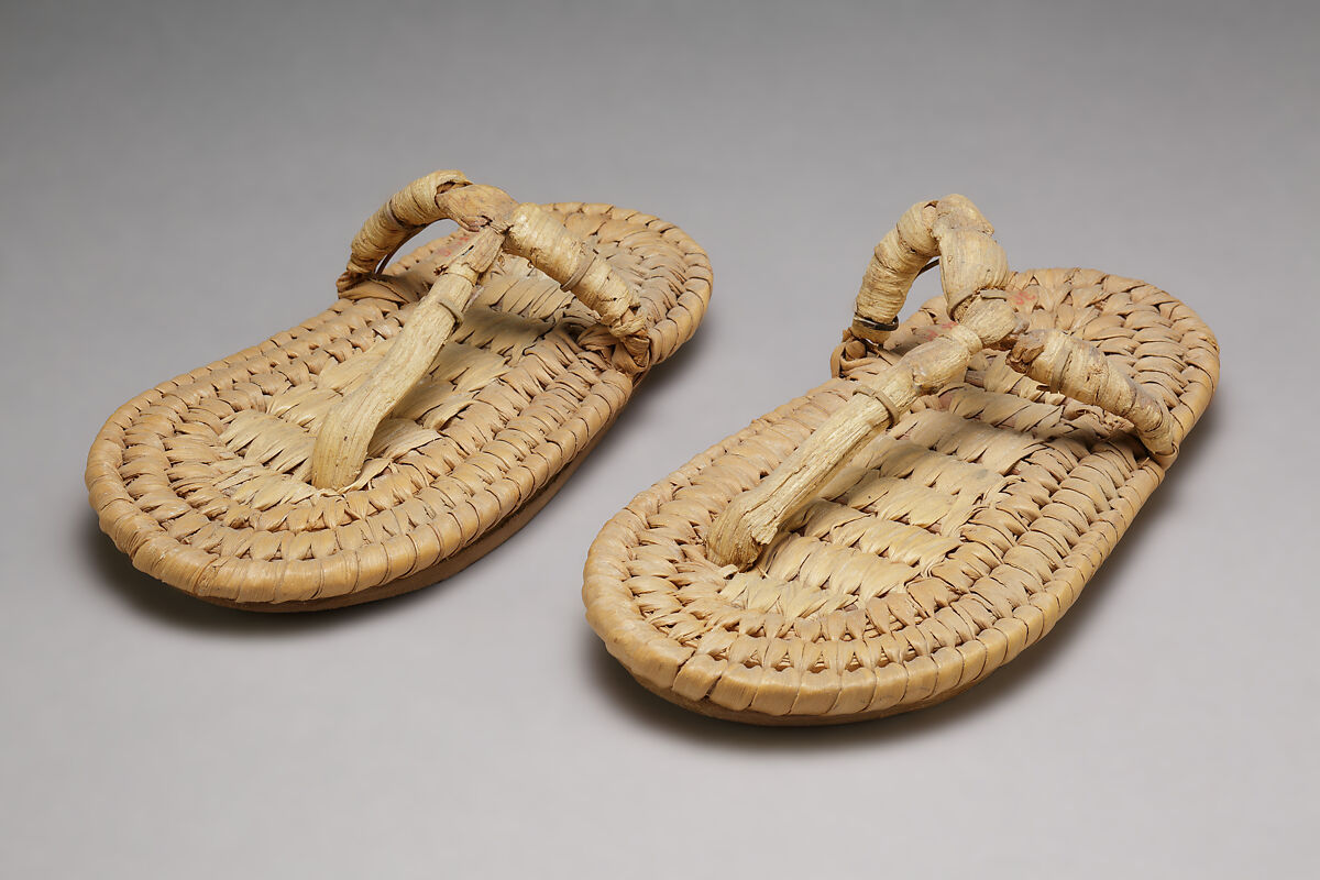 These sandals were made for a child. They were found in the stone chip debris on the hillside below the tomb chapel of Senenmut (TT 71). The sandals are similar to others in the collection that are fashioned from papyrus, palm leaf, and halfa grass. The finest of these (10.184.1a, b) were found in the Valley of the Kings tomb of Yuya and Tjuyu (KV 46), the grandparents of Tutankhamun.
