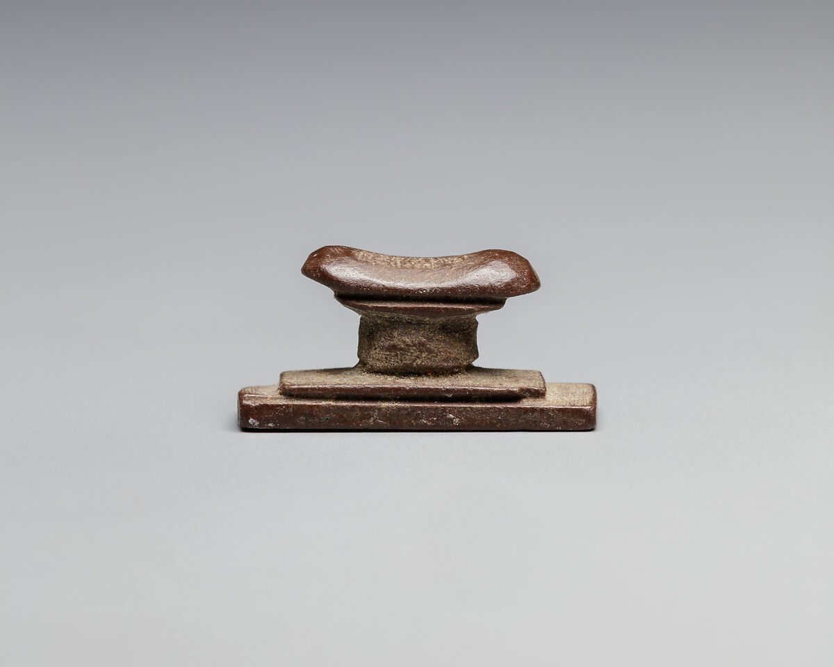 This miniature headrest–less than one inch long–is an amulet. Full-size headrests supported the neck of a sleeping person and were often decorated with protective symbols; examples were also placed in the tomb. Headrest amulets were exclusively used as funerary amulets. In addition to their protective function, further meaning derived from the formal resemblance between the round head on the curved headrest and the sun rising between two hills, a powerful symbol of resurrection and rebirth for the ancient Egyptians. Headrest amulets were meant to protect the head of the deceased and to reinsure his or her rebirth.