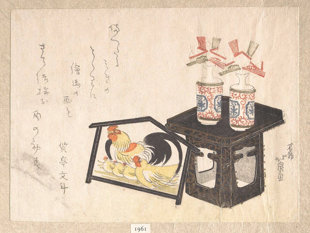 - Title: New Year’s Sake Bottles and Shrine Plaque (Ema) for the Year of the Rooster