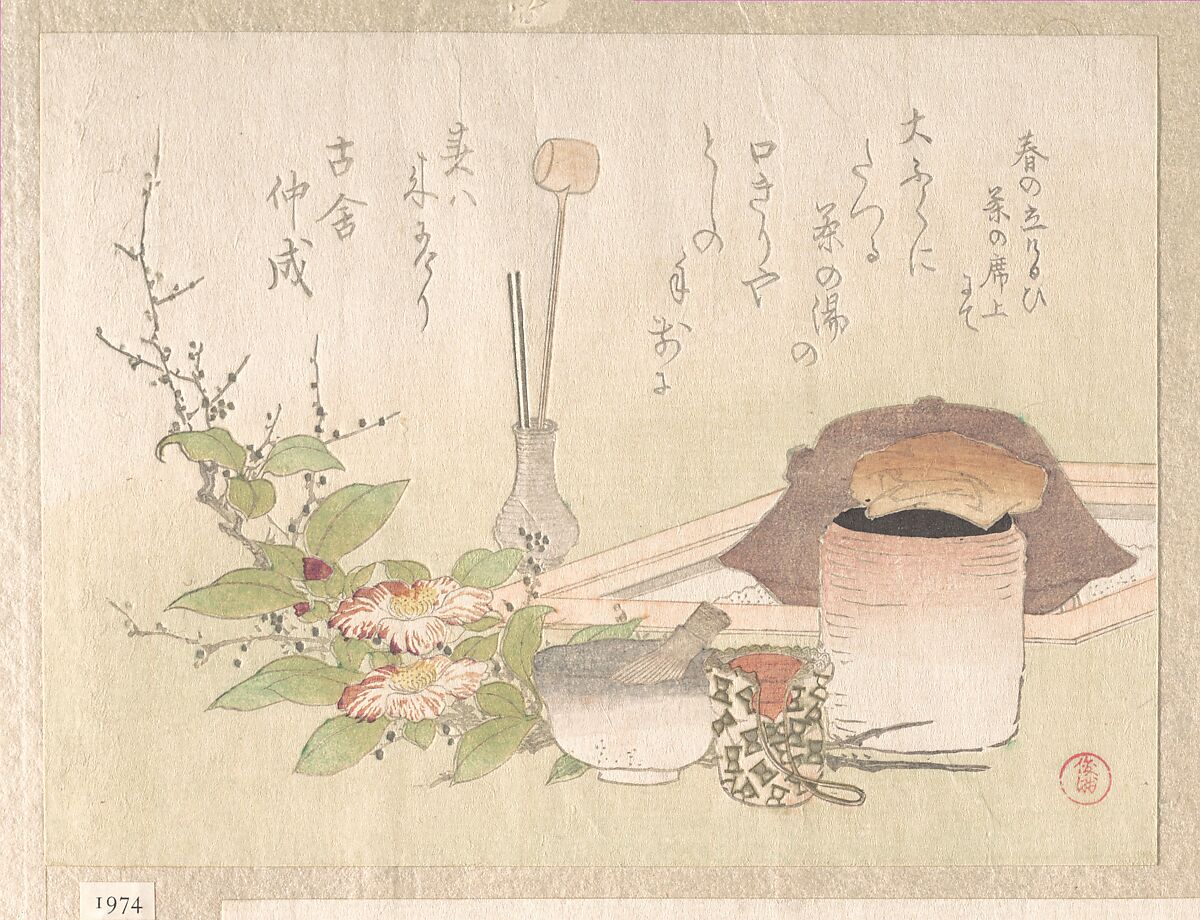 In this elegant still-life surimono by Shunman, accoutrements for a New Year’s tea ceremony are arrayed along with a branch of camellia, a flower that blooms at the end of winter and beginning of spring according to the lunar calendar. The poem reads: