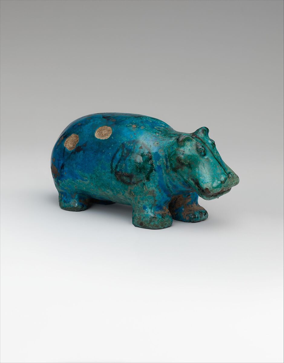 Among the faience animals found in Middle Kingdom tombs, the best known is undoubtedly the hippopotamus, rendered in a variety of poses that represent this fearsome animal in its natural state, and decorated with images of the plants and animals found in its marshy habitat. This small faience hippopotamus was found in the wrappings of Renisnenb's mummy at the small of the back. Also in the wrappings were a mirror (26.7.1351), a necklace (26.7.1349), and a shen amulet (26.7.1347).