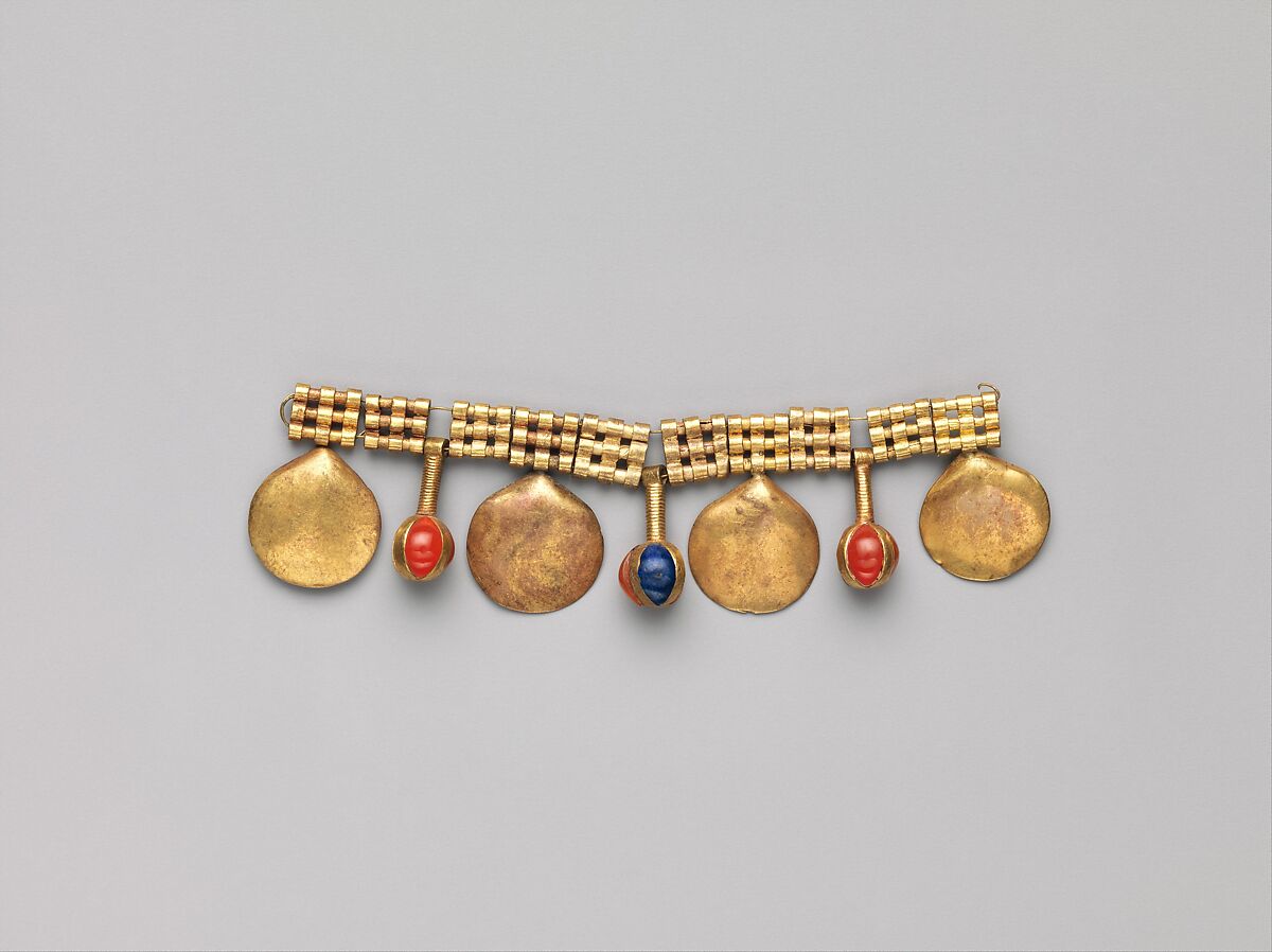 Ten units of triplex beads, four of which have bivalve shells pendant from them. Ball beads of gold and carnelian or lapis lazuli have been strung between the shells. These are connected stylistically with jewelry found by Jacques de Morgan in the 1890s in the pyramid of Senwosret III at Dahshur and likely beloged to princess or queen.