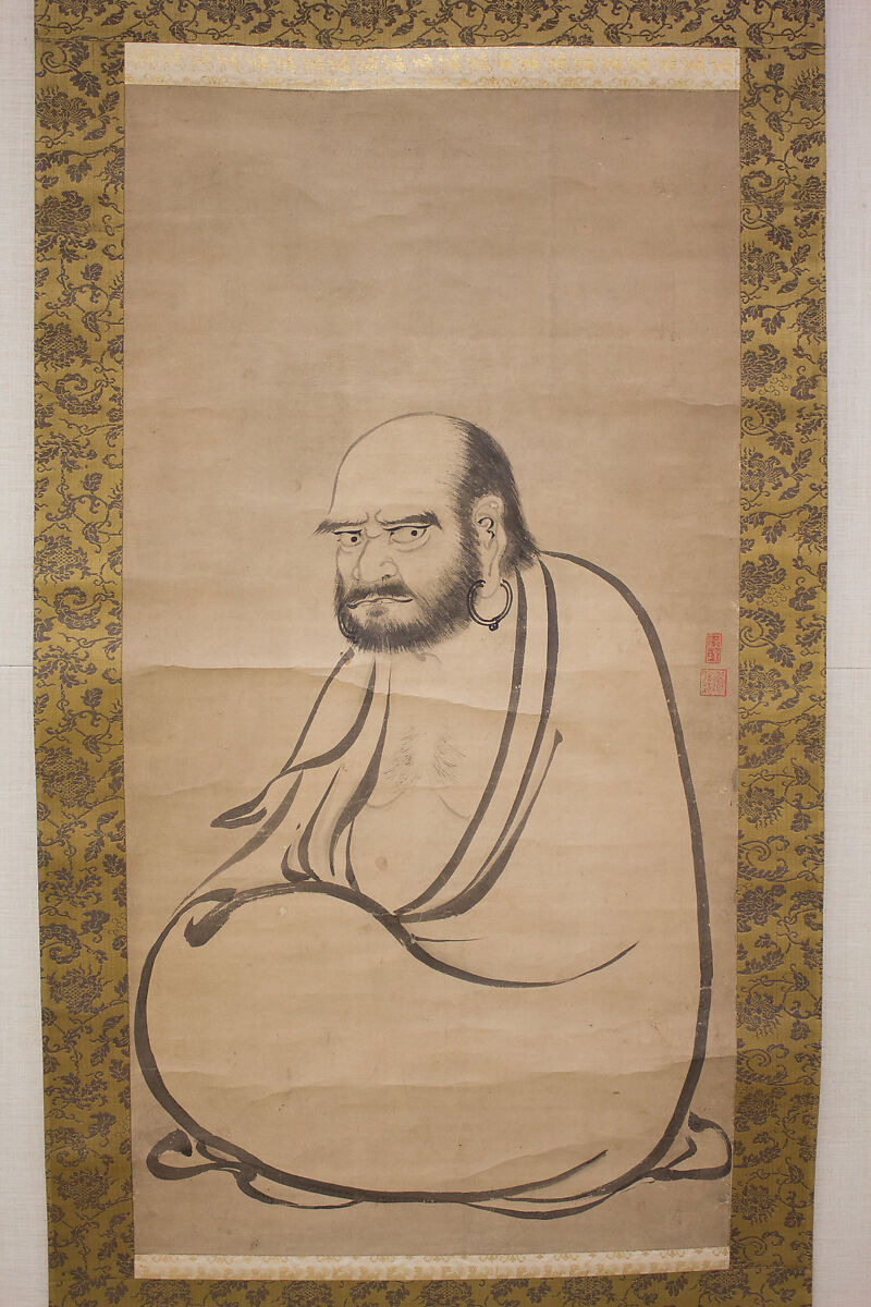 Bodhidharma was an Indian monk credited with transmitting Zen Buddhist teachings to China in the 500s. Known as "Daruma" in Japan, he is revered as the first patriarch of Zen. Here he is shown seated, casting his powerful gaze directly at the viewer and biting his lower lip. Following a longstanding approach to the depiction of Bodhidharma in East Asia, the artist emphasizes the figure's unkempt facial and body hair, as well as bulging eyes framed by pronounced eyebrows. He wears simple robes and large earrings. The two red seals at the right edge of the picture, reading "Shūri" and "Mitsuyori," are consistent with those found on works by Kano Sanraku, a follower of the great Momoyama-period master Eitoku (1543–1590) who led the Kyoto branch of Kano School (Kyōgano) in the early decades of the 1600s.