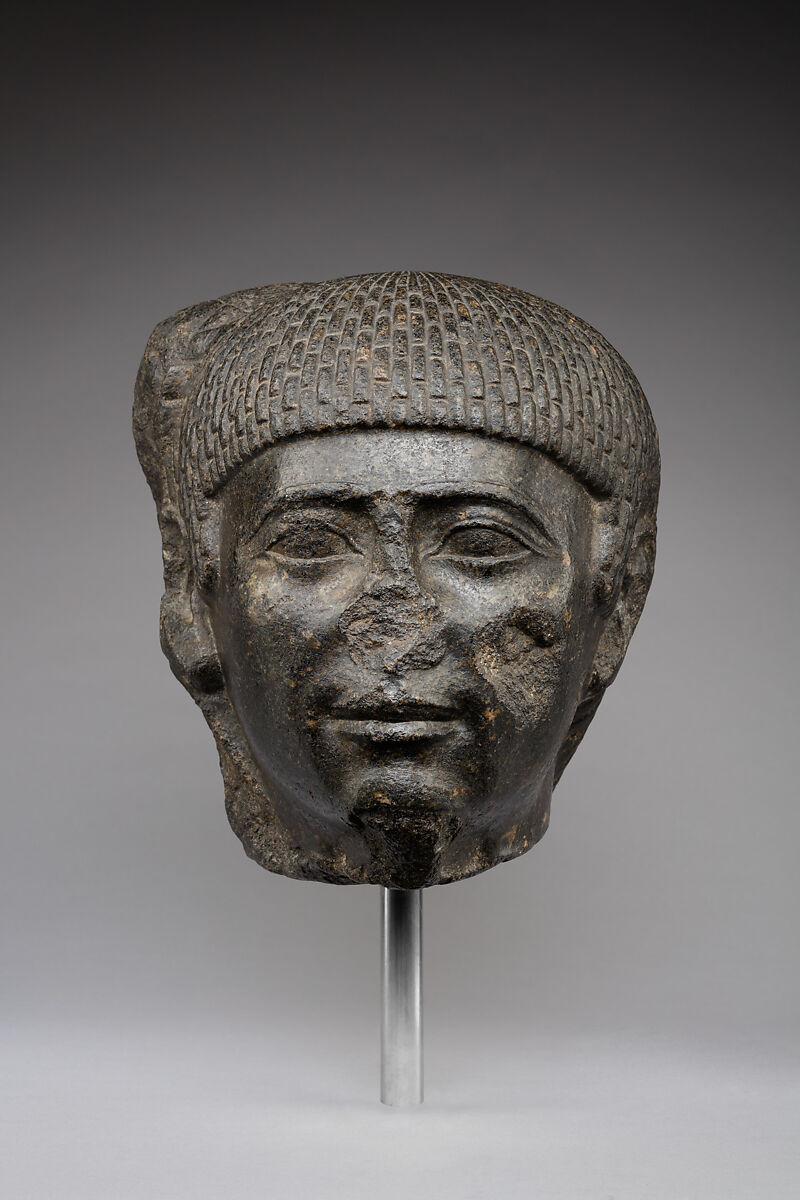 This finely modeled head wears a sidelock attached to the right side of his head. The sidelock is worn by children, royal sons, and by certain priests, particularly the High Priest of Ptah at Memphis, probably because the priestly role has some filial aspect. This statue might represent a king's son or, more likely, a High Priest of Ptah.