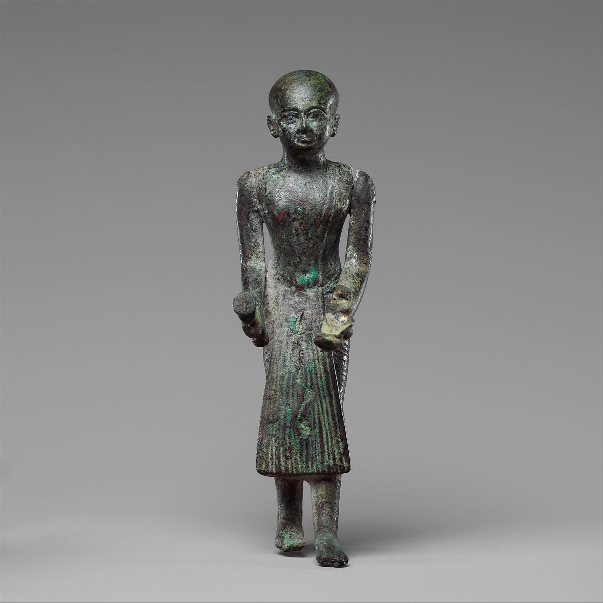 The dominant mode for metal statuary of nonroyal individuals during the first millennium B.C. was the ritual pose. Most statuettes in the genre display the shaved head, flowing garments, and other accoutrements that from the New Kingdom on were associated with priests. However, none of these priest-type figures can be definitively dated to the New Kingdom; this example has technical features that suggest a later date. It is thus possible that the placement of nonroyal ritual statuary in temples was an exception before the Third Intermediate Period.