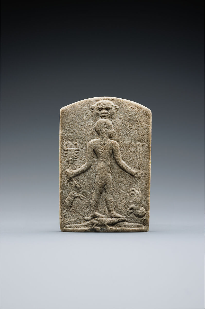 This miniature stela is carved in low relief with a figure of the child-god Horus trampling on two crocodiles. In each hand he holds a wild desert animal and either a scorpion or a snake, controlling these dangerous creatures with the help of the protective god Bes, who is shown above his head. The back and all four edges of this stela are carved with magical texts.