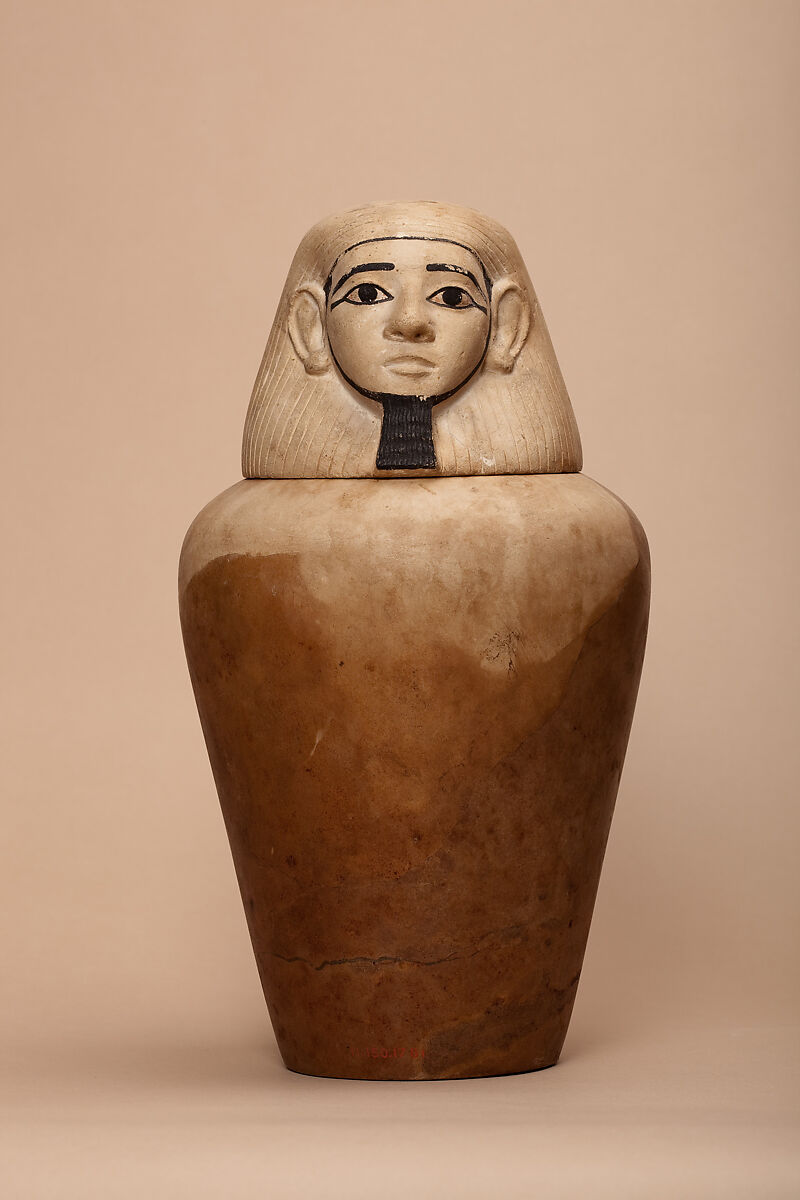 This Middle Kingdom canopic jar belongs to a set of four (11.150.17b–e), which were used to contain the viscera removed from the body during mummification. These four jars belong very probably to the burial of a mayor’s daughter called Nephthys (for her mummy, see 11.150.15c, and for her two coffins, see 11.150.15a, b). In earlier periods, canopic jars had simple disc-shaped or hemispherical lids. In the late First Intermediate Period to early Middle Kingdom, however, lids in the form of human heads were introduced.