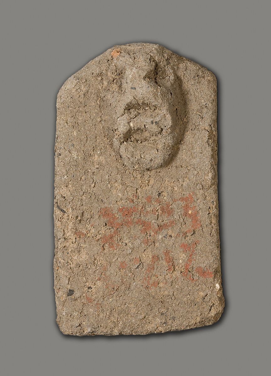 These tablets of unfired clay with attached crude faces were found as a group by the Museum's excavators at Lisht South in loose surface sand west of the mastaba of Senwosretankh, a high official and possibly the architect of the pyramid complex of Senwosret I (ca. 1961–1917 B. C.), east of which he erected his own very elaborate mastaba tomb (see acc. nos. 33.1.2 and other pieces). The mud figures and little coffin (acc. no. 33.1.66) that had contained some of them must have been buried, however, considerably later than the early twelfth dynasty tomb close to which they were found. In fact, during the thirteenth and following dynasties people deposited a number of objects in the by then sacred area around a legendary ruler's pyramid and its dependant monuments, believing conceivably that potent magical powers could thus be released. These flat mud figures, for instance, are inscribed in now much-faded red paint with the names of men identified as enemies (most of them Egyptians but some with foreign names). Their deposition may have been thought to effect their destruction.