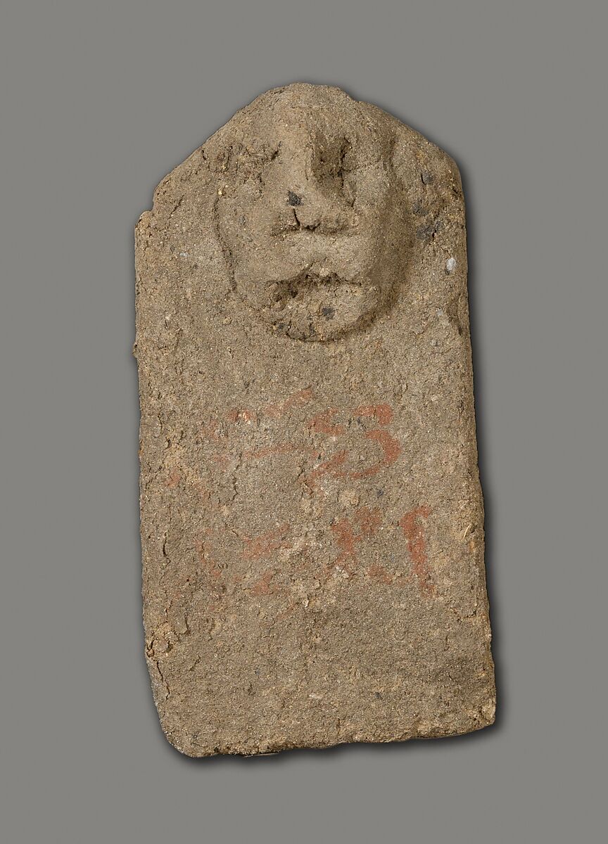 These tablets of unfired clay with attached crude faces were found as a group by the Museum's excavators at Lisht South in loose surface sand west of the mastaba of Senwosretankh, a high official and possibly the architect of the pyramid complex of Senwosret I (ca. 1961–1917 B. C.), east of which he erected his own very elaborate mastaba tomb (see acc. nos. 33.1.2 and other pieces). The mud figures and little coffin (acc. no. 33.1.66) that had contained some of them must have been buried, however, considerably later than the early twelfth dynasty tomb close to which they were found. In fact, during the thirteenth and following dynasties people deposited a number of objects in the by then sacred area around a legendary ruler's pyramid and its dependant monuments, believing conceivably that potent magical powers could thus be released. These flat mud figures, for instance, are inscribed in now much-faded red paint with the names of men identified as enemies (most of them Egyptians but some with foreign names). Their deposition may have been thought to effect their destruction.