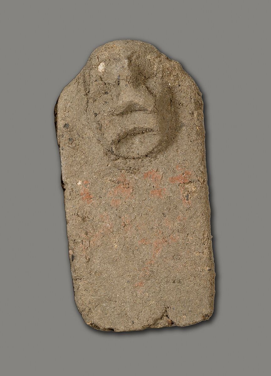 These tablets of unfired clay with attached crude faces were found as a group by the Museum's excavators at Lisht South in loose surface sand west of the mastaba of Senwosretankh, a high official and possibly the architect of the pyramid complex of Senwosret I (ca. 1961–1917 B. C.), east of which he erected his own very elaborate mastaba tomb (see acc. nos. 33.1.2 and other pieces). The mud figures and little coffin (acc. no. 33.1.66) that had contained some of them must have been buried, however, considerably later than the early twelfth dynasty tomb close to which they were found. In fact, during the thirteenth and following dynasties people deposited a number of objects in the by then sacred area around a legendary ruler's pyramid and its dependant monuments, believing conceivably that potent magical powers could thus be released. These flat mud figures, for instance, are inscribed in now much-faded red paint with the names of men identified as enemies (most of them Egyptians but some with foreign names). Their deposition may have been thought to effect their destruction.