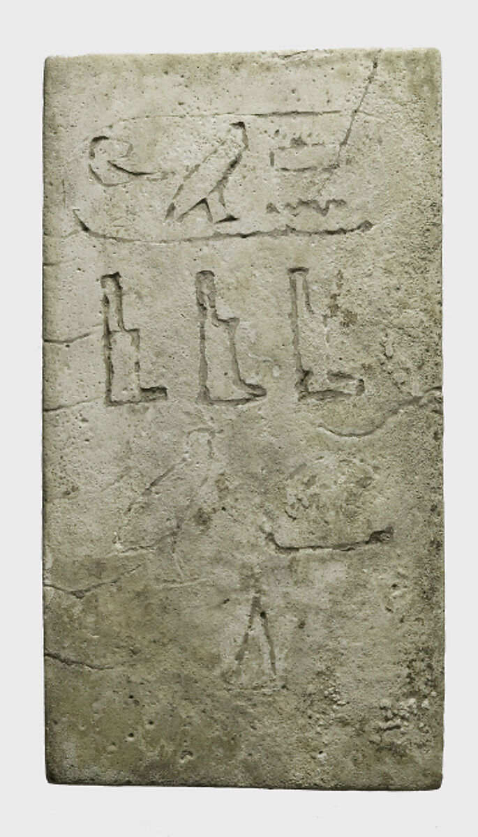 This plaque was discovered in a foundation deposit at the southwest corner of the pyramid temple of Amenemhat I at Lisht. The inscription provides the name of the pyramid itself, "the thrones of Sehetpibre (Amenemhat I) have appeared in glory."