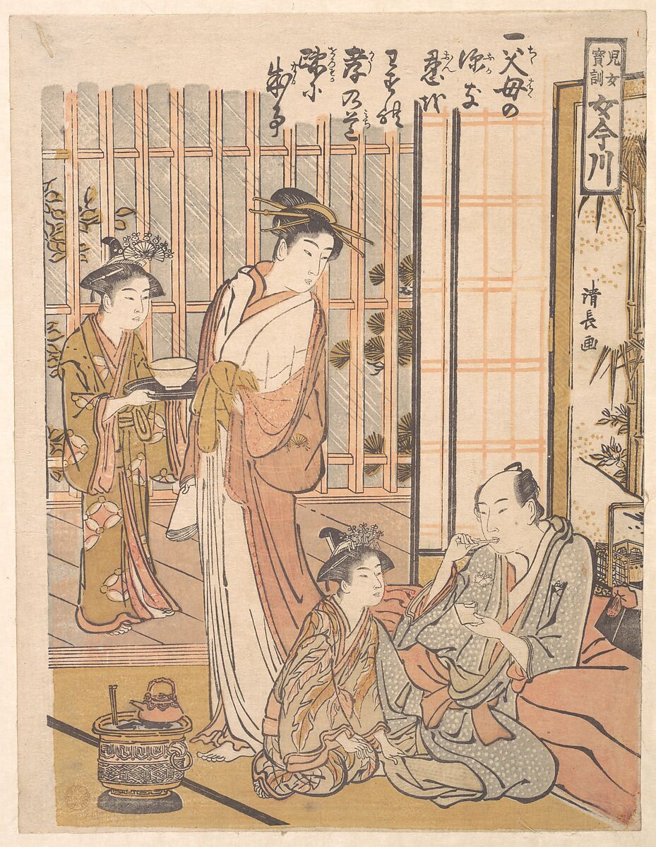 A rainy morning outside the licensed pleasure quarters further delays a disheveled young man who nonchalantly brushes his teeth while his companion and her maids look on with barely concealed impatience. The inscription, "Forget not your parents' love; respect the virtue of filial piety," is in satiric contrast to the scene, which in other circumstances might indeed reflect a family at its morning routine.