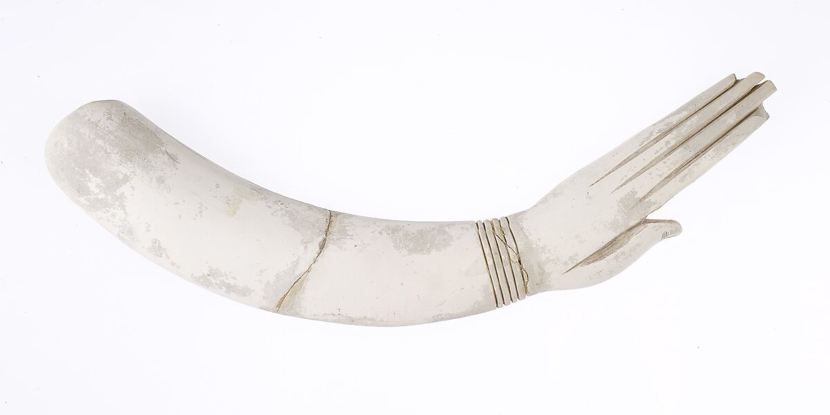 Clappers are among the earliest percussion instruments in ancient Egypt. This clapper is shaped like a forearm and hand; a bracelet adorns the wrist. Clappers were used in all activities featuring music or singing, such as banquets, funerary processions, and rituals.