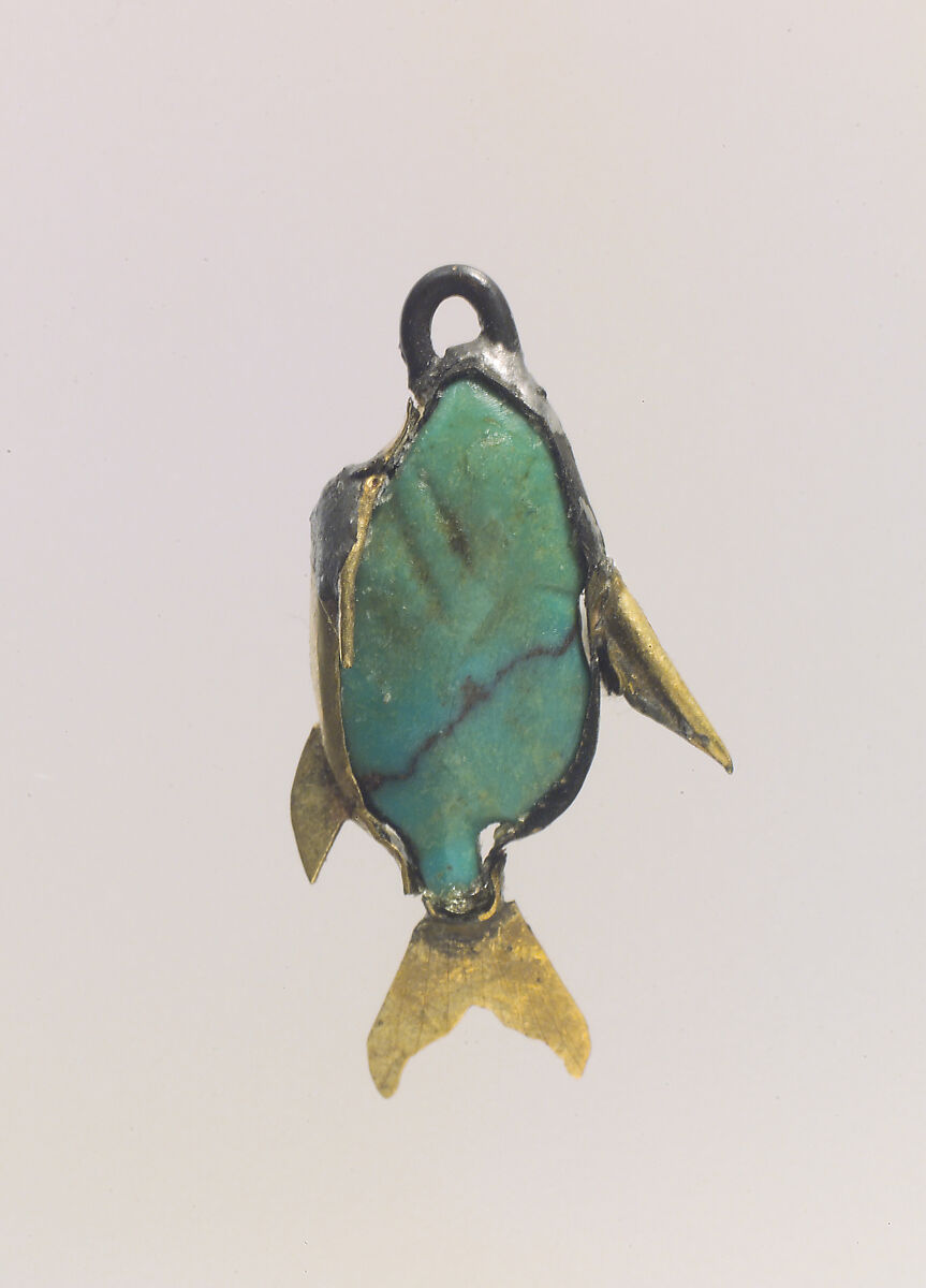 The loop for suspension at the mouth of the fish shows that it would have hung vertically as a pendant. Its overall shape with a sharp dorsal fin allows to determine that this is a Synodontis batensoda. More detailed pendants confirm this identification. This type of catfish often swims upside down very close to the surface and is hence also called the "upside-down catfish."