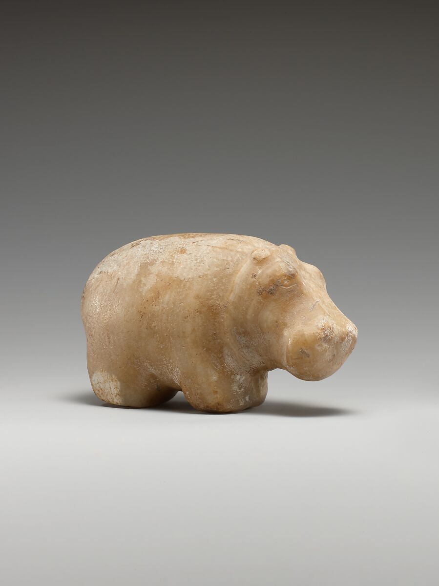 Throughout the Predynastic Period (ca. 4400-3100 B.C.), representations of hippos were placed in tombs and other ritual contexts. This animal was feared and as a result became the subject of hunting scenes. Others, however, were depicted pregnant and so may have served as fertility symbols. In this example, neither function appears likely. Here the hippo may have symbolized the Nile River, a critical feature of the ancient Egyptian’s world.