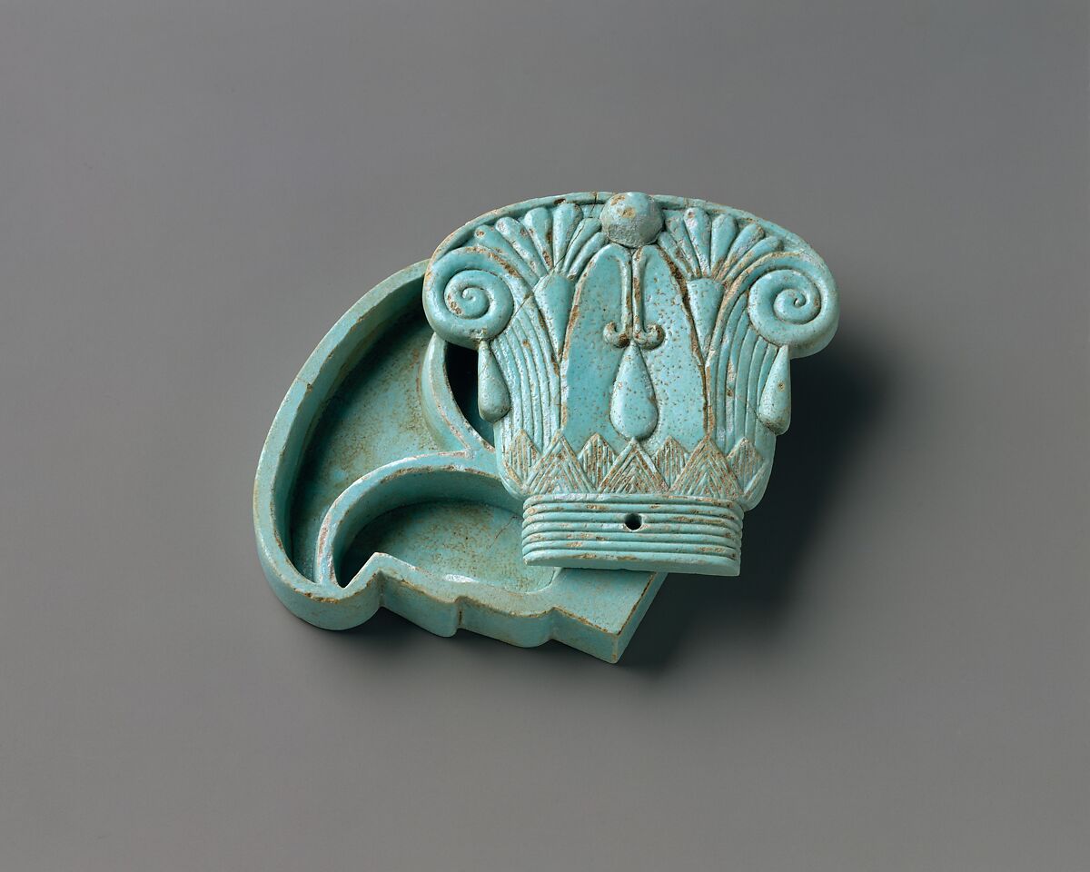 The lid of this delicately carved box created in glassy blue-green faience represents a column capital of a type well known from architectural examples in extant Ptolemaic Period temples. The precise date of the piece is undetermined because such boxes are extremely rare. The origin of the type can be traced back to cosmetic spoons and boxes of the late New Kingdom (ca. 1390–1070 B.C.), but the earliest representations of a similar capital is found in a fourth century B.C. tomb.