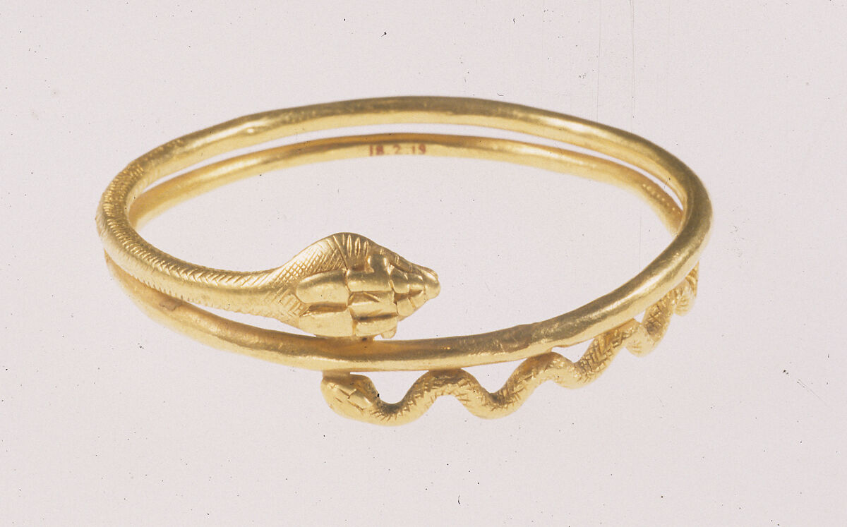 Snake jewelry was not limited to Egypt in the Ptolemaic and Roman Periods, and, in fact, was not a traditional Egyptian sort of jewelry before the Ptolemaic Period. Bracelets with animals, including snakes, appeared in Western Asia from about the eighth century BC, and spread to Greece in the fifth century BC, and came to Egypt mainly with the Ptolemaic Dynasty. In Greek culture there were certainly healing associations with snakes, but there may have been other assocations, too.