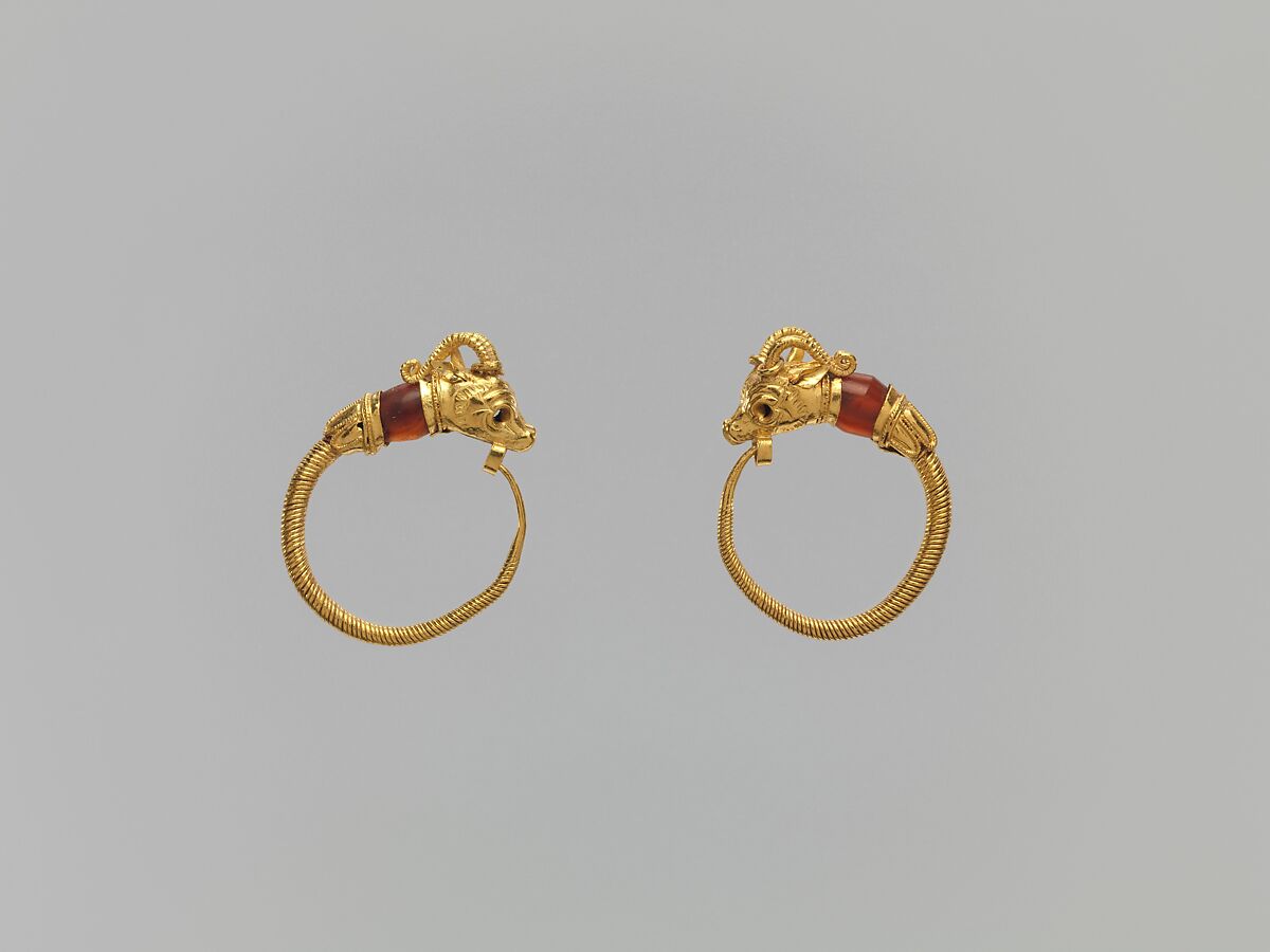 Hoops formed of wound wire with animal head terminals are the commonest type of Hellenistic earring. The heads on these earrings have been referred to as those of gazelles, but is now thought more likely to be an ibex. Ibex-head earrings are well-known in Egypt, but also Asia Minor and Cyprus.
