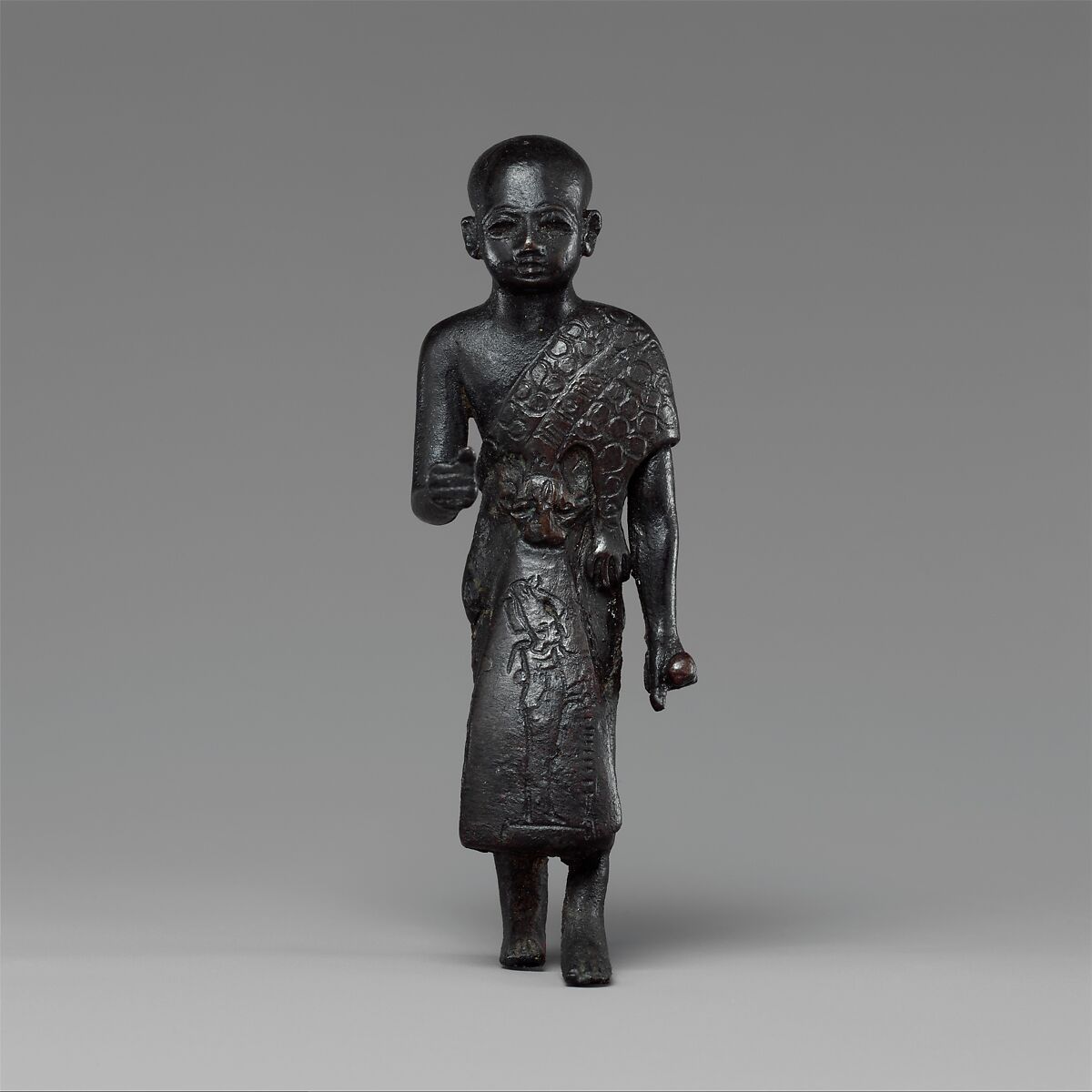Over the leopard skin this man is wearing is a banderole inscribed with the remnants of his name and titles: “God’s Father, God’s Beloved, . . .Haty. . . .” It has been suggested that the presence of the titles and names of the subject rather than the king may be characteristic of the Kushite or very early Saite Period. If true, this would agree with the stylistic traits—broad neck, round skull, and small chin—that also link this figure to that era.