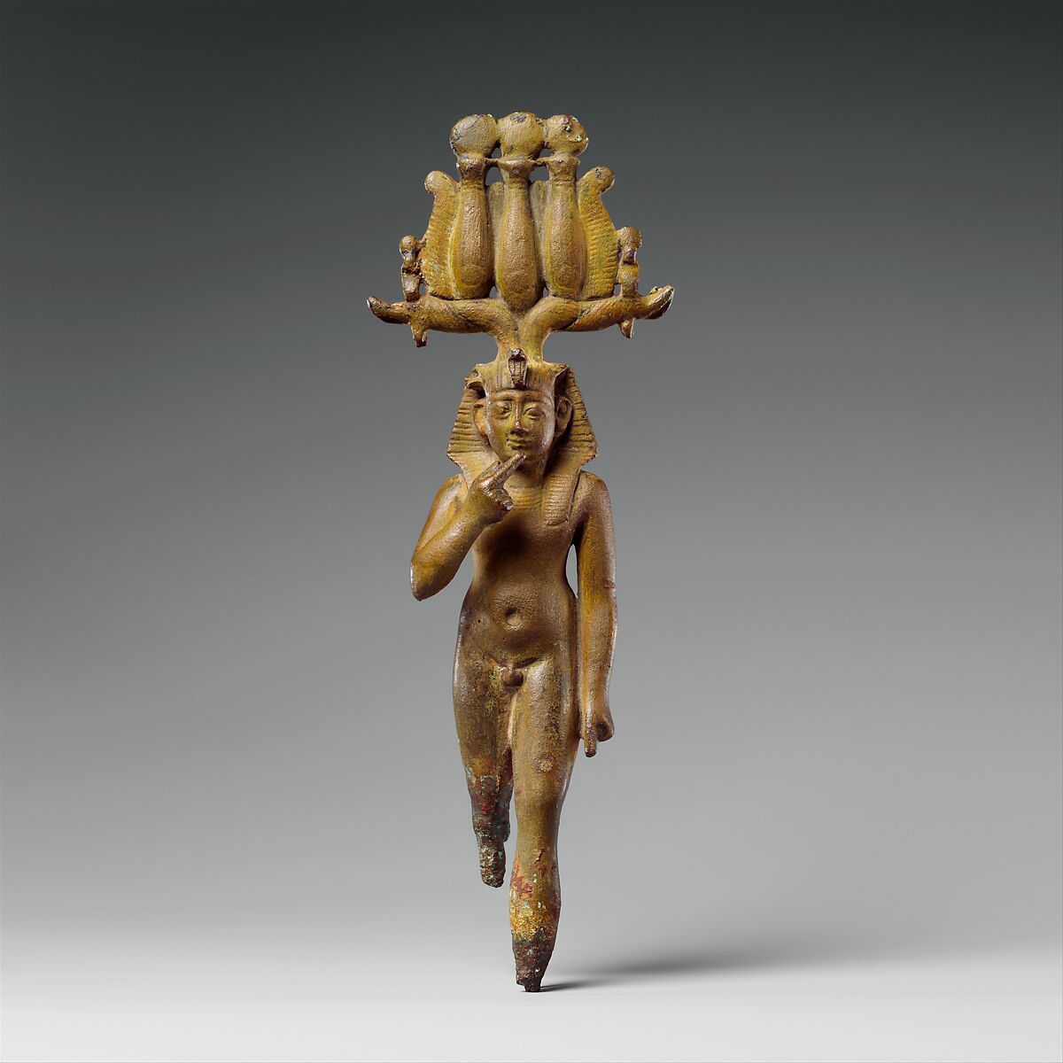 This small statuette of a child god was found in the catacombs of the Falcon Complex in the Sacred Animal Necropolis at North Saqqara, where offerings made in the shrine were buried after an undetermined period. Inscribed material suggests this branch of the catacombs was sealed in about 89 B.C., dating the statuette to that time or earlier.