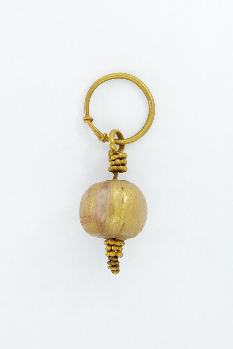 Gilded or silvered glass was especially popular from the mid first century BC to the mid first century AD. Here a gilded bead hangs as a pendant from a hoop with ring beads of granules above and below the bead.