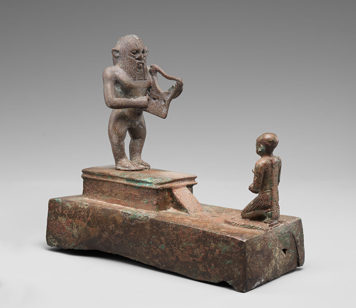 Bes was worshipped and invoked by ordinary Egyptians as a protector. His usual depiction, as a grotesque dwarf with a lion's ears and mane, was thought to deter the approach of the malevolent forces believed to cause illness. His image here appears in a bronze statuette made for the unnamed man shown worshipping the god. The lyre held by Bes may reflect his power to calm angry spirits.