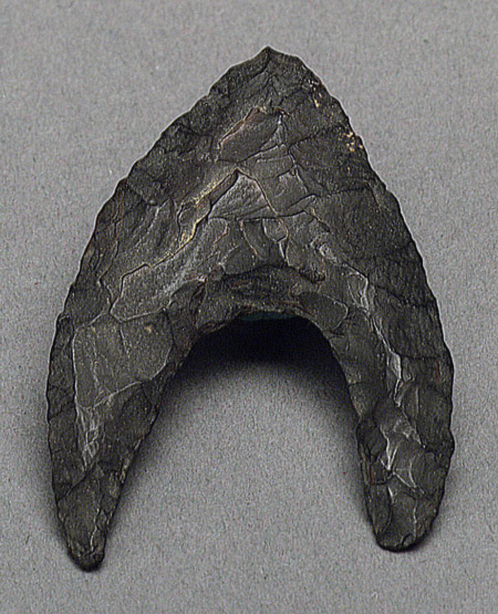 During the Epipaleolithic period (ca. 10,000–7000 B.C.), tools that we call arrowheads appear for the first time. The hollow-base arrowhead illustrated here was a common type in the Neolithic period (ca. 7000–4500 B.C.), when the habitation of the Nile valley itself was underway. These projectile points were most often made from chert, often called flint, which was found in the form of cobbles lying on the high desert's surface. Whether the arrowheads were attached to wooden shafts or used in spears is difficult to confirm, but representations of men drawing bows can be seen on jars from the early Predynastic Period (ca. 3600 B.C.).