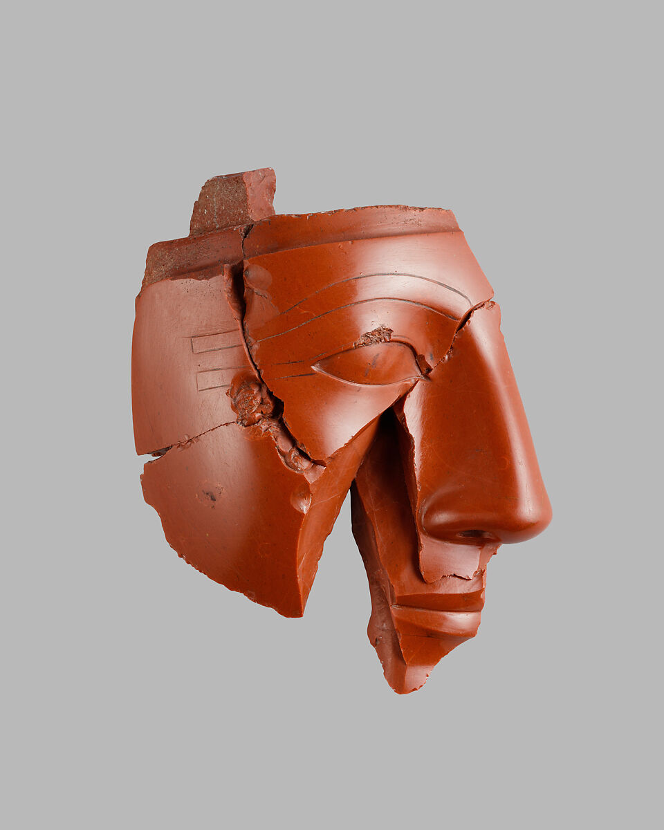 For many years the fragments of this face were dispersed in various collections, but in 1993 it became possible to reunite the pieces through an exchange with the Petrie Museum, London (the cheek, 1993.27a, b), and a long-term loan from the Musée du Louvre, Paris (the eye, L.1993.21a, b). Part of a red jasper thumb in the collection (26.7.1398b) probably belonged to the same statue.
