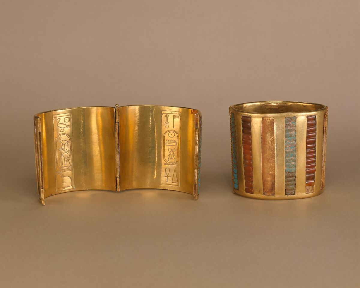 Three pairs of hinged bracelets (26.8.125–.130) are associated with the tomb of three foreign wives of Thutmose III. They are all made of burnished gold inlaid with carnelian and glass that was originally turquoise and dark blue, but has faded. Each is inscribed on the inner surface with the cartouches and epithets of Thutmose III suggesting that they were a gift of the king.