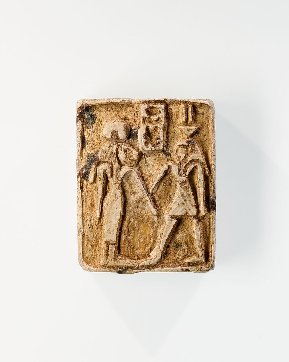 On one side, this rectangular stamp seal is decorated in relief with the image of the goddess Sakhmet (at left) facing the god Nefertum (right). Between them is the name Menkheperre, the throne name of Thutmose III.