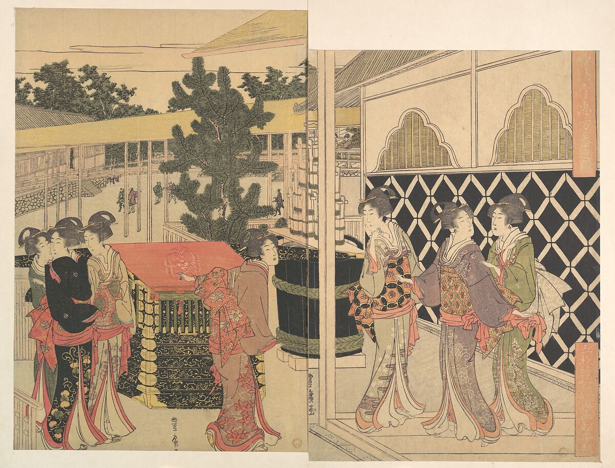 Toyohiro did not make as many prints as paintings. These two prints, the rightmost of a set of five, illustrate a group of women paying homage at Myōhōji temple, which is dedicated to the founder of the Nichiren sect. Toyohiro portrayed the elegant women against a backdrop of the Myōhōji temple precinct rendered in Western perspective (uki-e).