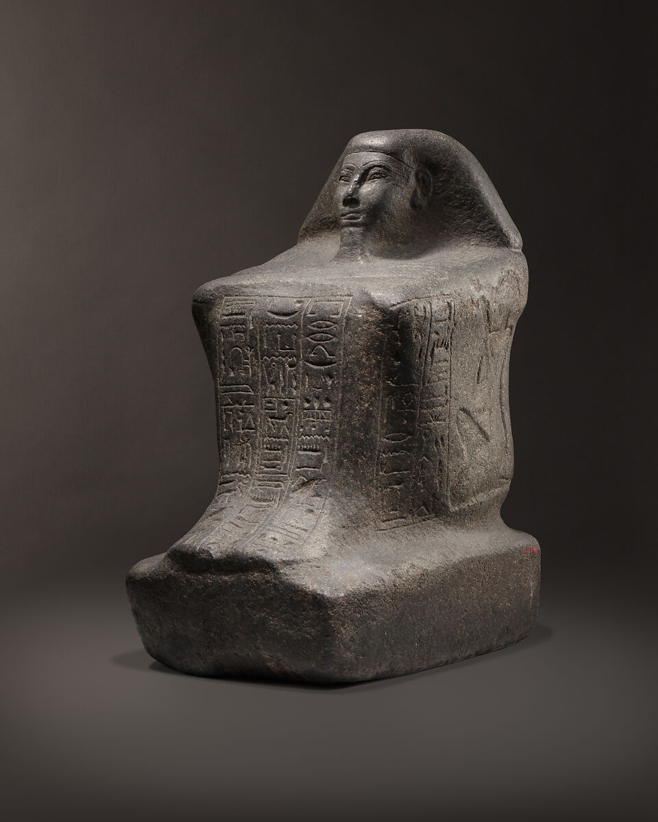 Nedjem held the office of "god's Father" in the mortuary temple of King Merneptah during the reign of Ramesses III; the cartouches of both rulers are inscribed on his shoulders. His statue bears inscriptions on all four sides; the front panel contians an offering prayer addressed to the Theban triad of Amun, Mut and Khonsu. Depictions of Nedjem's wife and son appear on the right and left sides respectively. Nedjem dedicated this statue in the Eleventh Dynasty temple of Mentuhotpe II at Deir el Bahri so that he might partake of the offerings made to the gods worshipped there. The lopsided features and crude incised inscription indicate the decline in artistic quality whichi is frequently encountered in the sculpture of the Twentieth Dynasty.