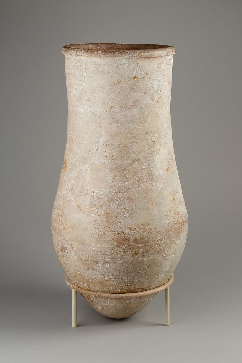 This large open-mouthed jar is one of approximately a dozen discovered in a pit (KV 54) in the Valley of the Kings during excavations sponsored by Theodore M. Davis in 1907. The jars contained objects inscribed with the name of an obscure king by the name of Tutankhamun. In 1909, Davis gave several jars and their contents to the Metropolitan Museum where they are on display in gallery 122.