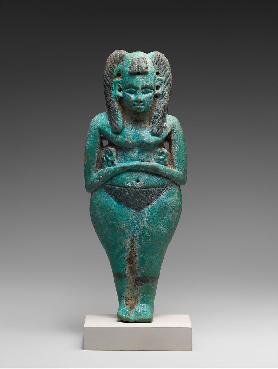 This figure is part of a repertoire of figures created in a distinctive spotted faience from dynasty 22 into dynasty 26. The center of production was the eastern Delta, in particular Bubastis and Tanis; this was an area where Near Eastern peoples had long been interwoven in the population; at this time it was also a center for the settlement of Libyan tribal peoples. Possibly these conditions influenced this particular production.
