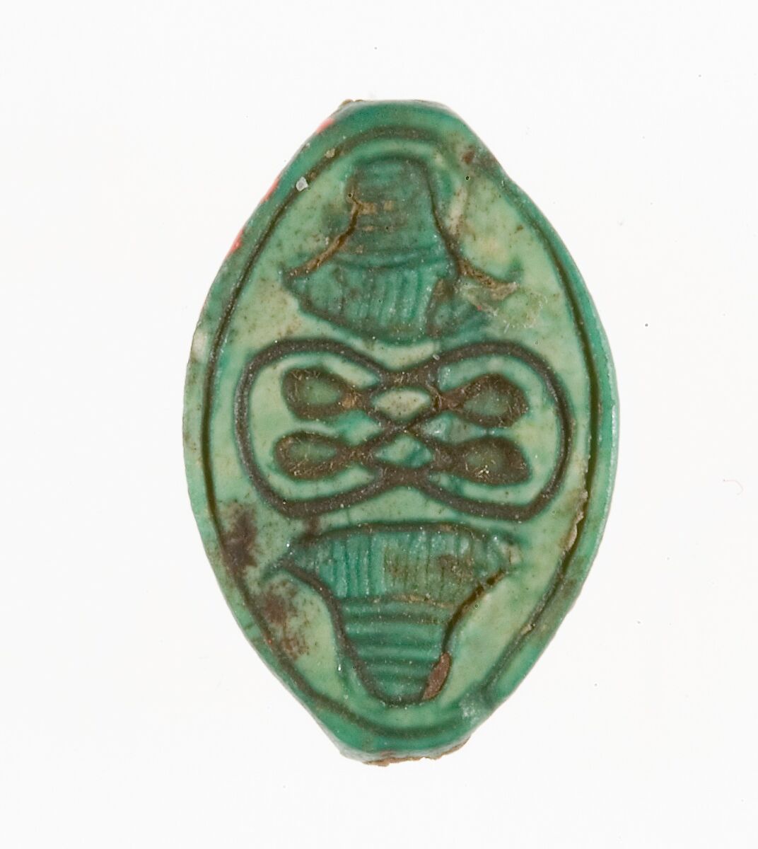 Most of the amulets found in the foundation deposits of Hatshepsut's funerary temple were scarabs, but a hand full were carved in the shape of a cowrie shell. Like this one, the backs of most of these cowroids have been incised with a decorative pattern that suggests the setting of a swivel ring bezel (see 36.3.46). Others (27.3.180) have also been inscribed with the image of a bolti fish (a tilapia), and two have been carved with the image of a falcon, with its wings outstretched and wearing an atef-crown (27.3.164, 27.3.396).