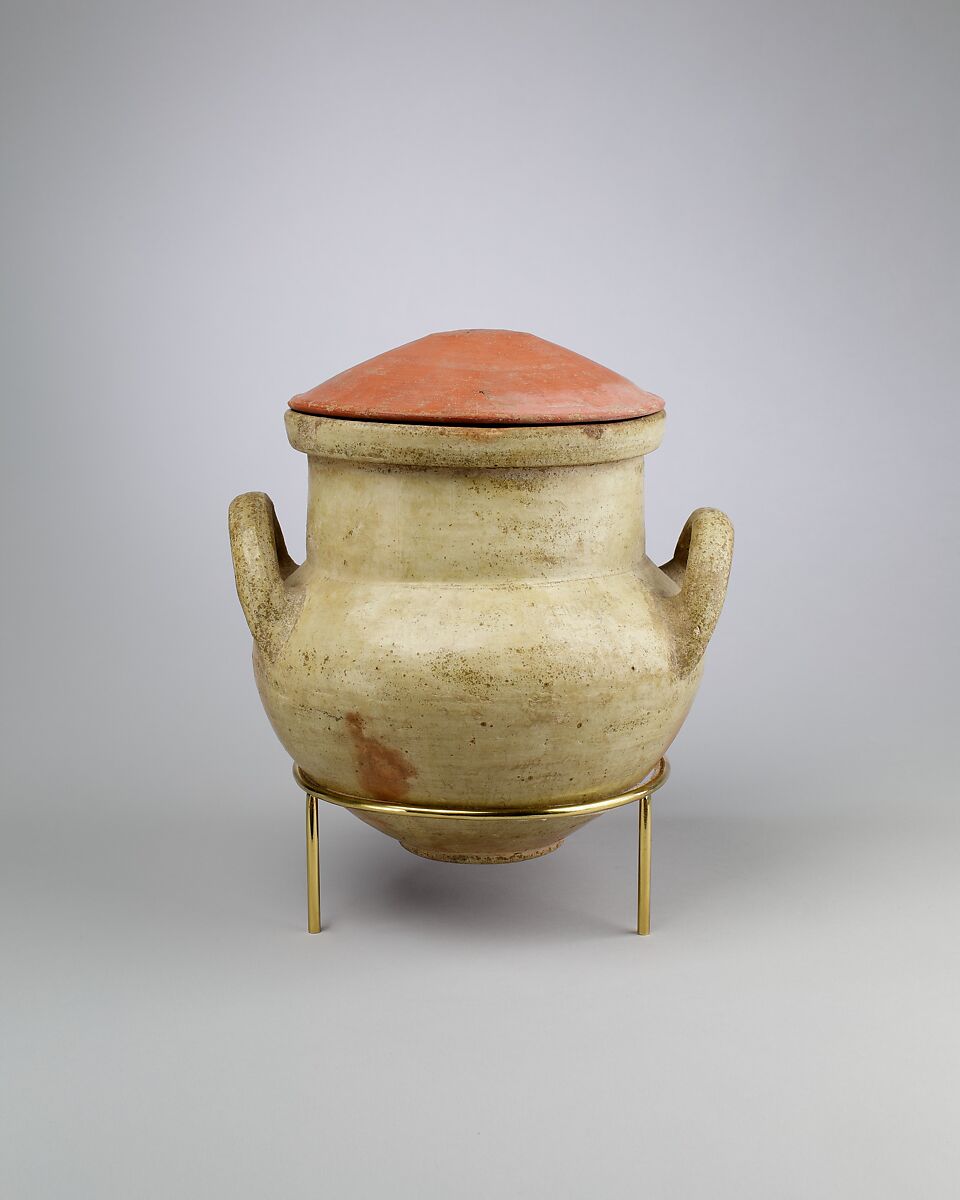These are marl-clay pots excavated in the North Suburb at Amarna. The lentoid flask (29.7.1) is a type that originates outside Amarna itself. It probably came with particular trade contents: many such lentoid flasks from Amarna show a pitting on the interior that suggests their special contents was somewhat corrosive. The two-handled jar (29.7.2) is lidded with a small upside down silt-clay dish . It had a brown contents when excavated. The jar was found in a house with many others, some sunk into the floor for storage, and plentiful remains of pigments in the house suggested to the excavators that it belonged to a painter.