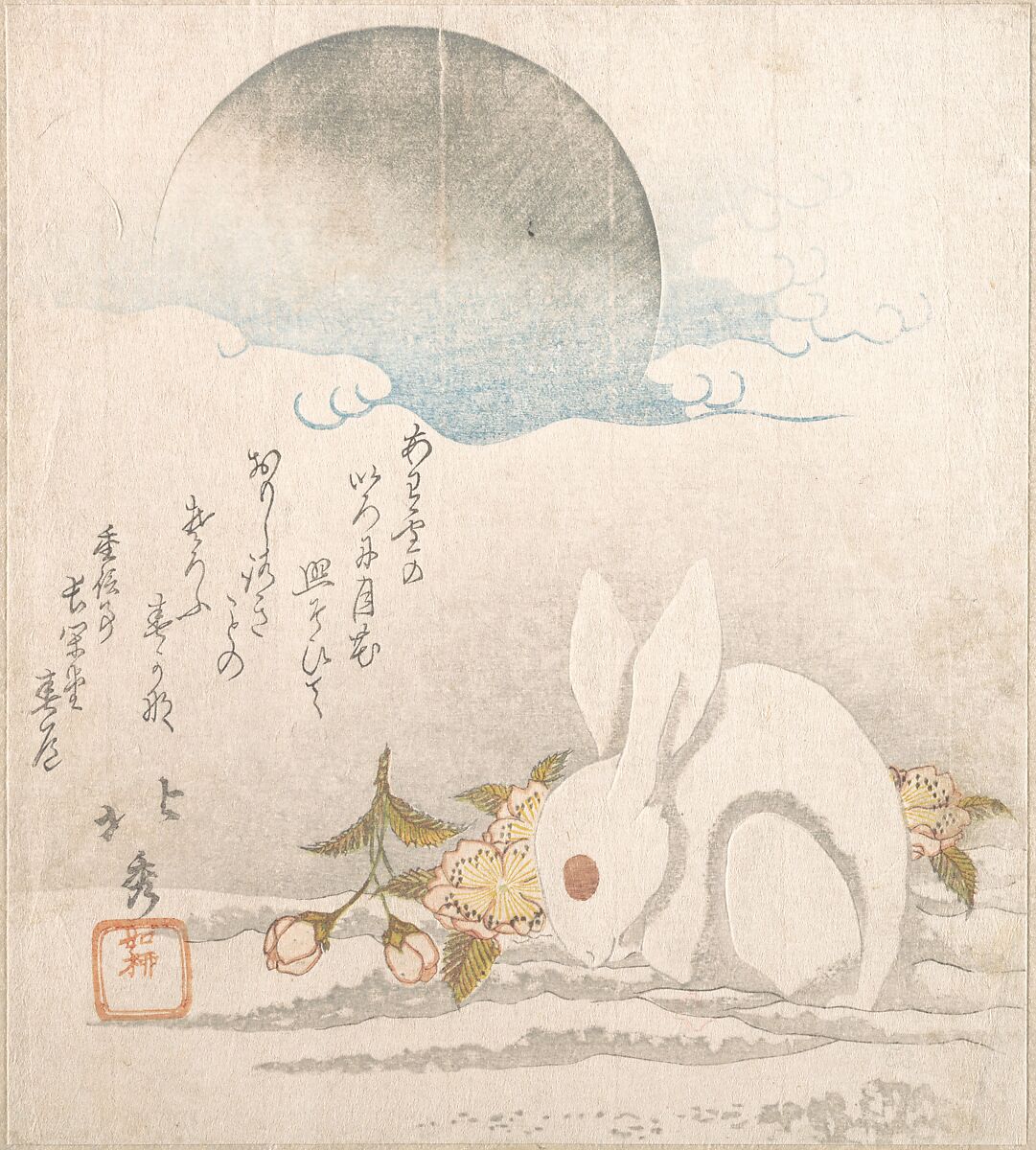 A white rabbit crouches in the snow beneath a silvery moon emerging from the clouds. A few buds and blossoms of plum are scattered nearby.This surimono (privately published woodblock print) was created to celebrate the first lunar month of spring of the year of the rabbit, 1819. The poet Chōkandō Harumichi 長閑堂春道 wrote a 31-syllable kyōka verse on the traditional poetic topic of snow, moon and flowers, and how they all appear together in this New Year’s scene: