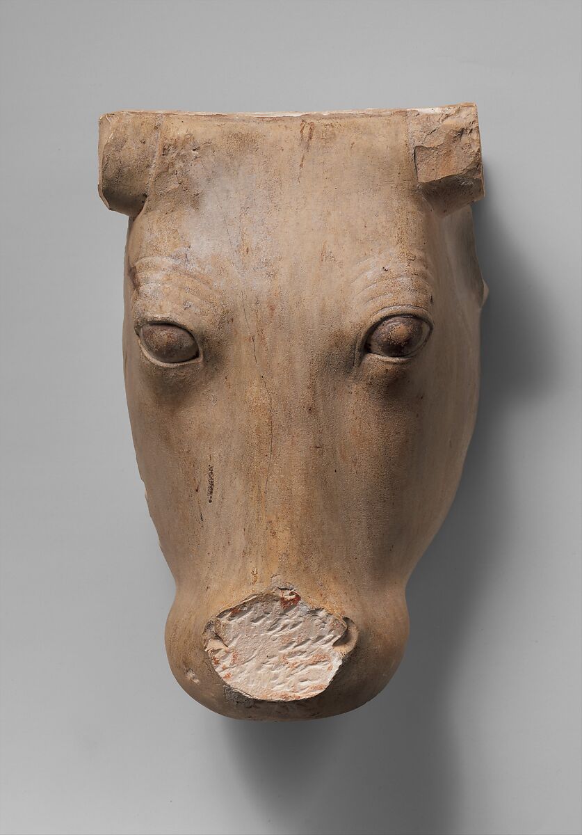 Recent work at the tomb of Nespekashuty (see 23.3.468) has shown that this cow head, excavated by the Museum in the 1920s, stood over a statue of a wrapped figure. The cow was rendered as if emerging from the north wall false-door niche in the second room of the tomb and the wrapped figure, representing the tomb owner Nespekashuty, stood against its breast.