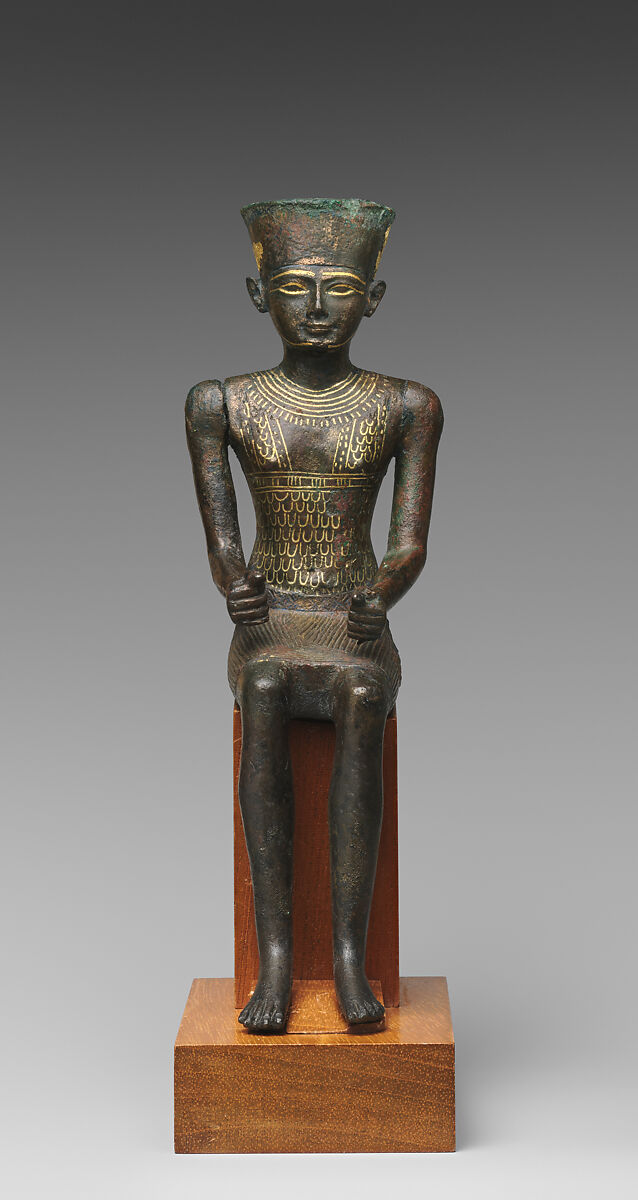 Extensive inlay, atypically thin and angular body modeling, and facial features that approximate New Kingdom Thutmoside or early Ramesside prototypes all suggest this seated statuette of Amun belongs to the Third Intermediate Period. Technical features such as the hollow casting and separately cast arms fit well in the same timespan.
