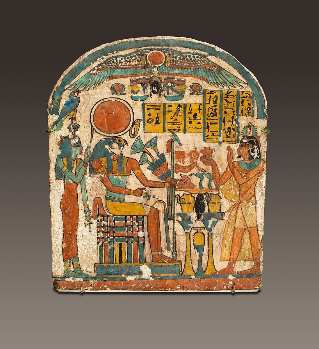 Inscribed for Saiah himself, this stela is painted on both sides. On the front, the deceased, to viewer right, presents a heart-shaped object to a figure of the falcon-headed god Re-Harakhty-Atum, who sits on a cubic throne atop a reed mat. Before the god is a table piled high with offerings, and standing behind him is the goddess of the West, Imentet. In the lunette of the stela is a winged sun disk, two wedjat eyes (eyes of Horus), and two shen rings, symbols of eternity. The inscription above the offering table asks that Re-Harakhty-Atum, lord of the Two Lands and of Iunu (Heliopolis) give offerings. Above Saiah's head is written, "the Osiris, the purification priest of Amun who has no fault, Siah, son of Djed-Bastetankh."