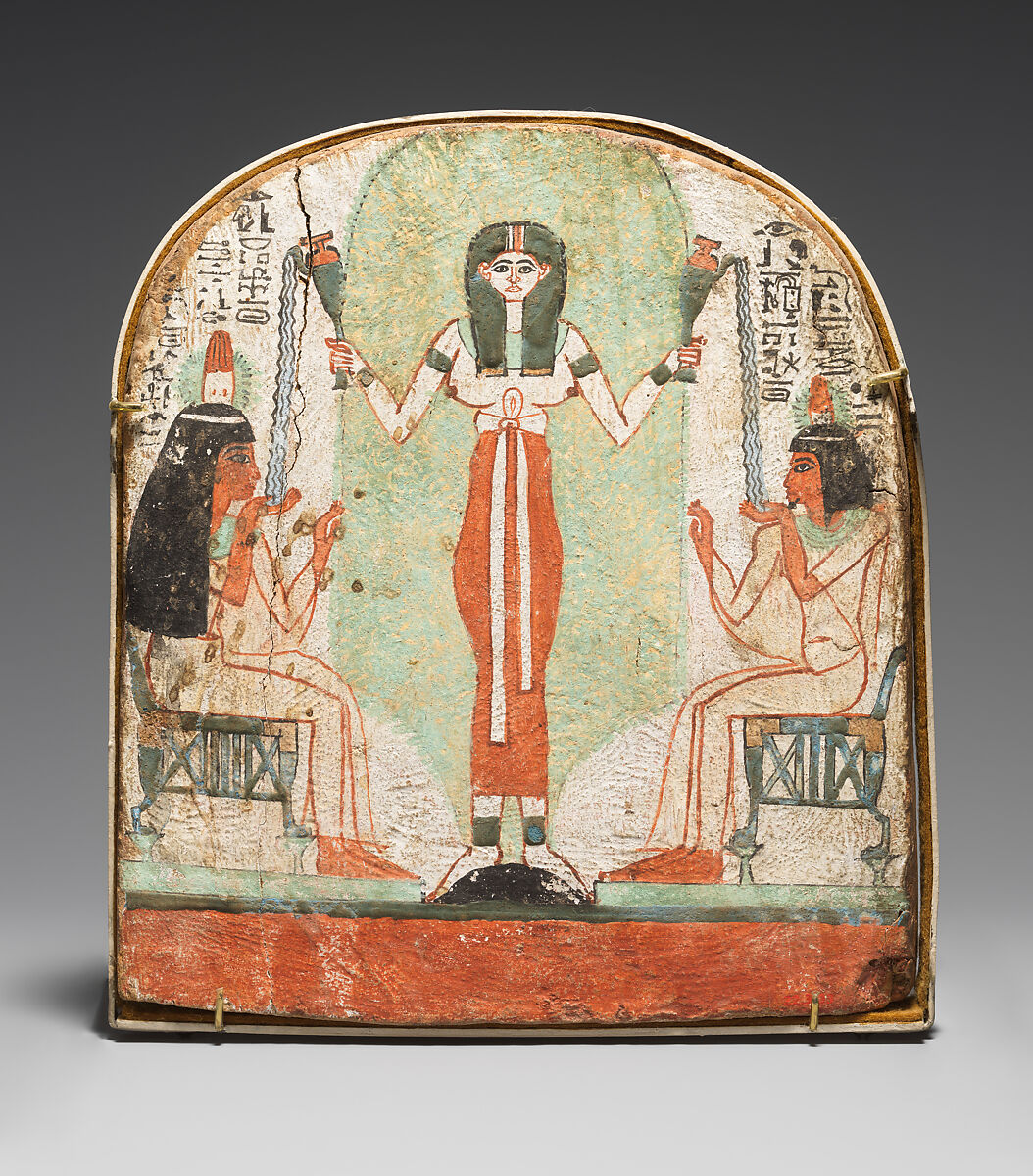 This is one of four stelae found near the doorway of the brick chapel of the family of Saiah, a wab, or purification priest of Amun who lived during the latter half of the 22nd Dynasty. The original tomb in whose courtyard this chapel was built dates to the 11th Dynasty, over a century earlier. All of the stelae are made of wood, painted in green, red, yellow and black on a white gesso ground.