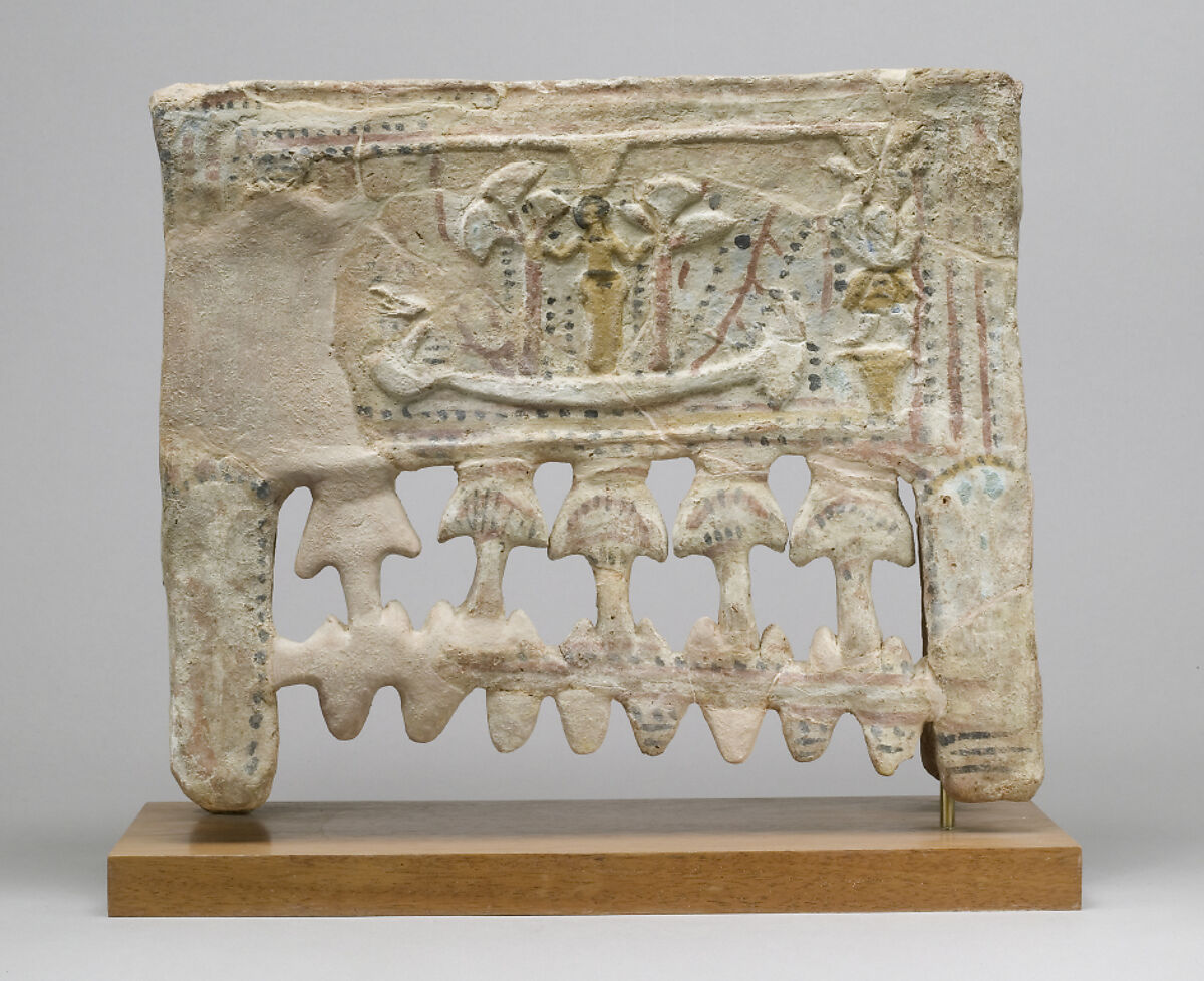The decoration of these objects includes frontal standing nude females in boats with figureheads like sacred barks, Bes figures, and particular vegetation; some other examples include a kneeling female playing a lute. The decoration carries with it significations for female fertility, conception, and birth. However, it also seems likely that votive beds are associated with the Egyptian New Year festival, and the myth of the return of the absent goddess and the flood. This is indicated, for example, by the crown worn by the female figure, which is one usually worn by Anuqet, a goddess linked to the return of the flood. The origin of the particular bed-form and the use of the objects are hardly clear, but based on analysis of find spots it has been suggested that the objects are associated with the coterie of temple women around the god Amun and the God’s Wives.