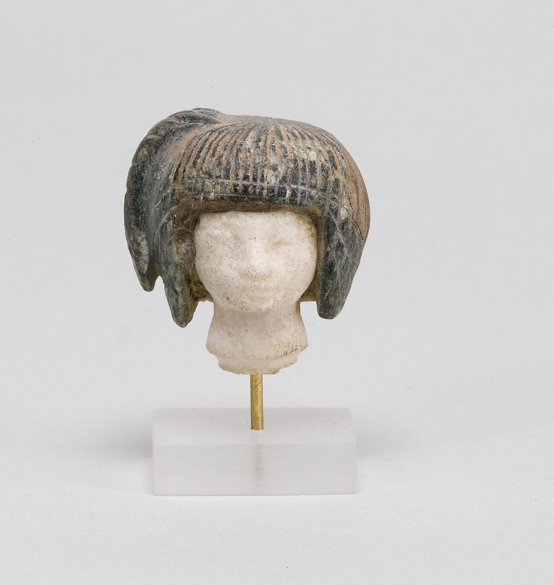 Cosmetic spoons in the shape of swimming girls were popular luxury goods in the New Kingdom. This exquisite travertine head, topped with an elaborately modeled wig of schist, incised to deliniate the individual locks, is all that is left of such a spoon (see 26.2.47for a complete example).