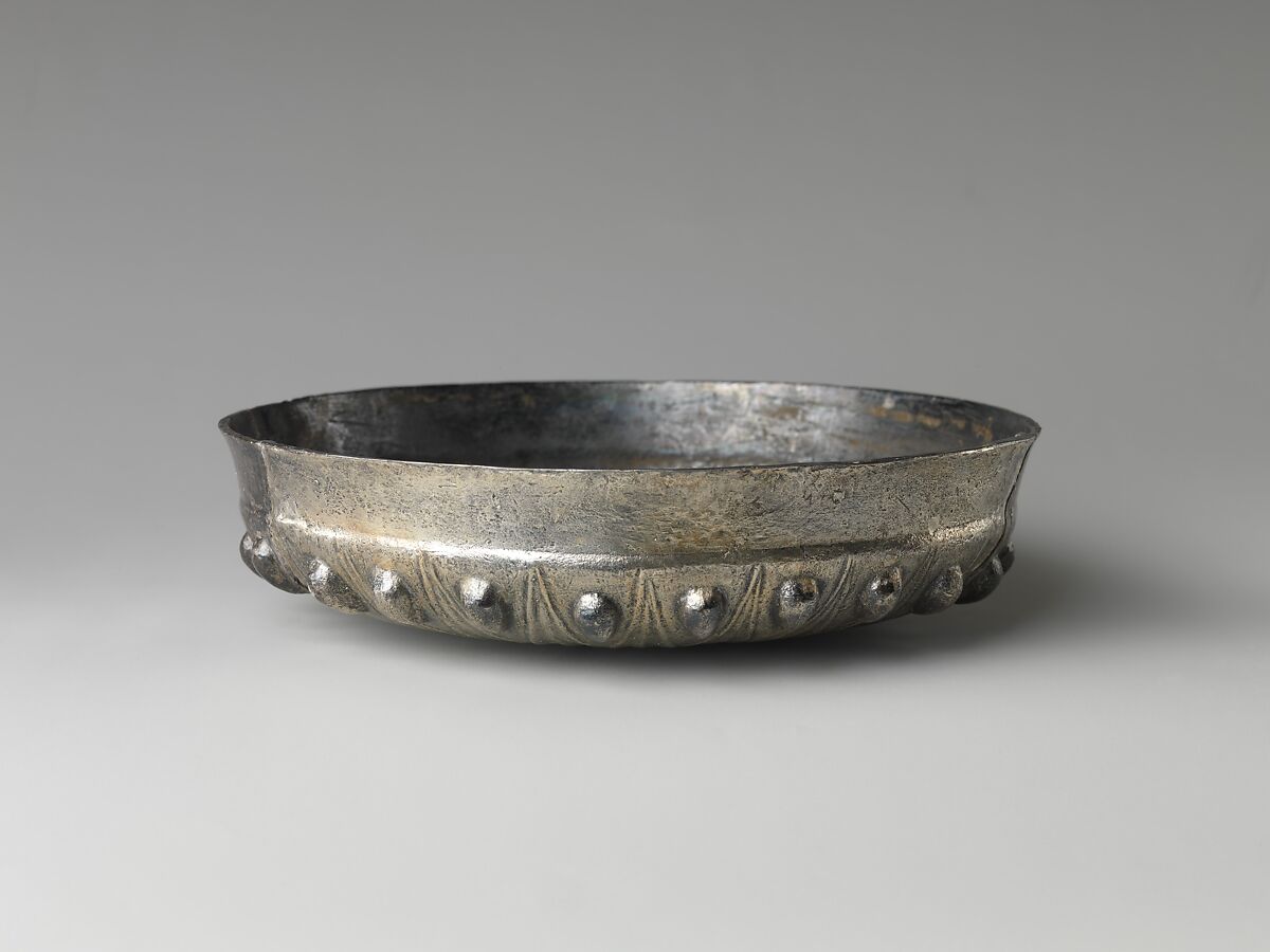 The heavy silver vessels 18.2.13-18.2.17 are in created in a decorative style widespread in the Greek world, and can be dated to the fourth century BC. They. are said to have been found together in the Egyptian Delta.