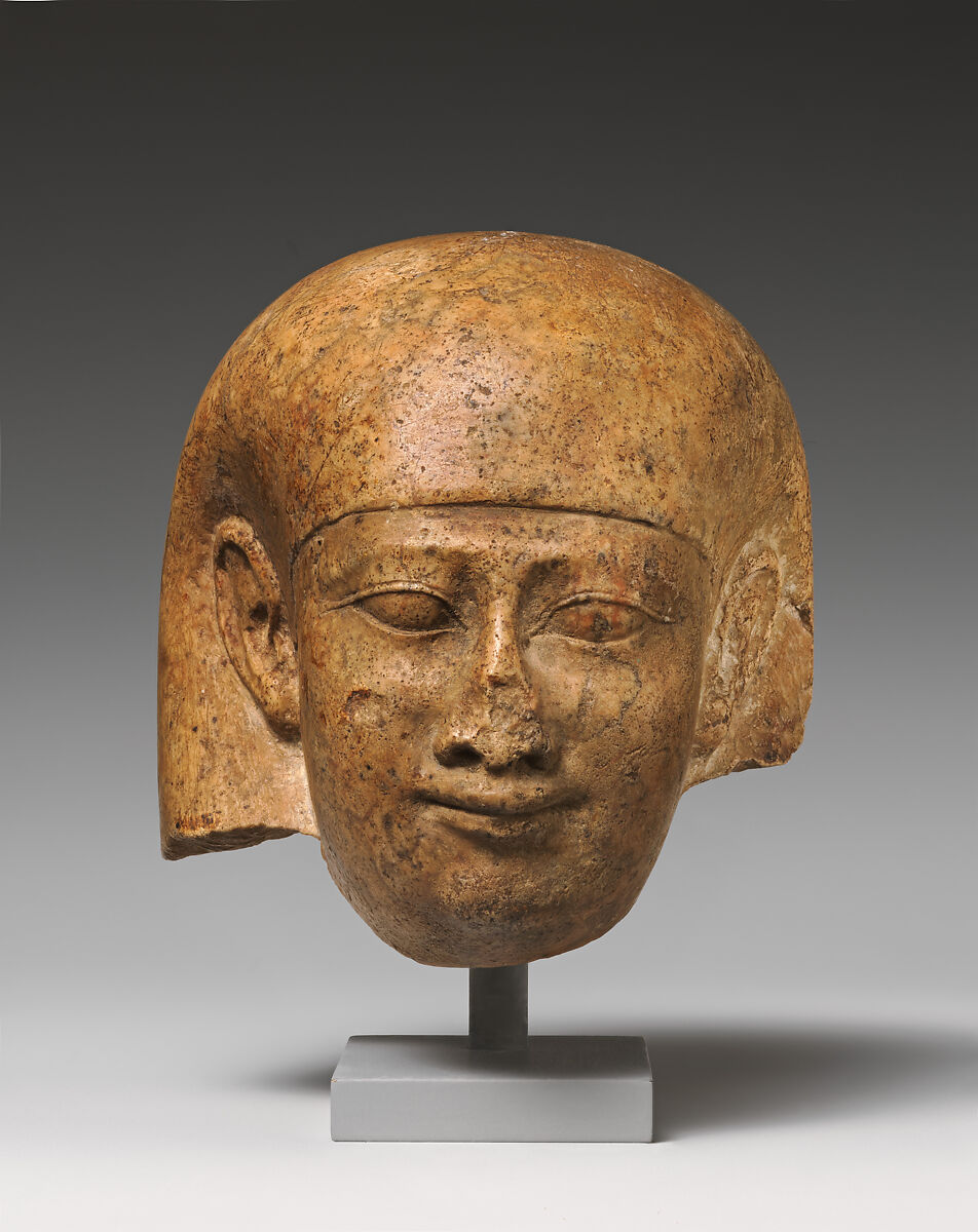 Although the size of this head testifies to a very small statue, its commissioner was able to acquire a fine dense quartzite stone. The head shows no evidence of adjacent horizontal surfaces such as one would expect with a block statue, so it was most probably part of a small striding statue, and could also have held a divine figure or a naos.