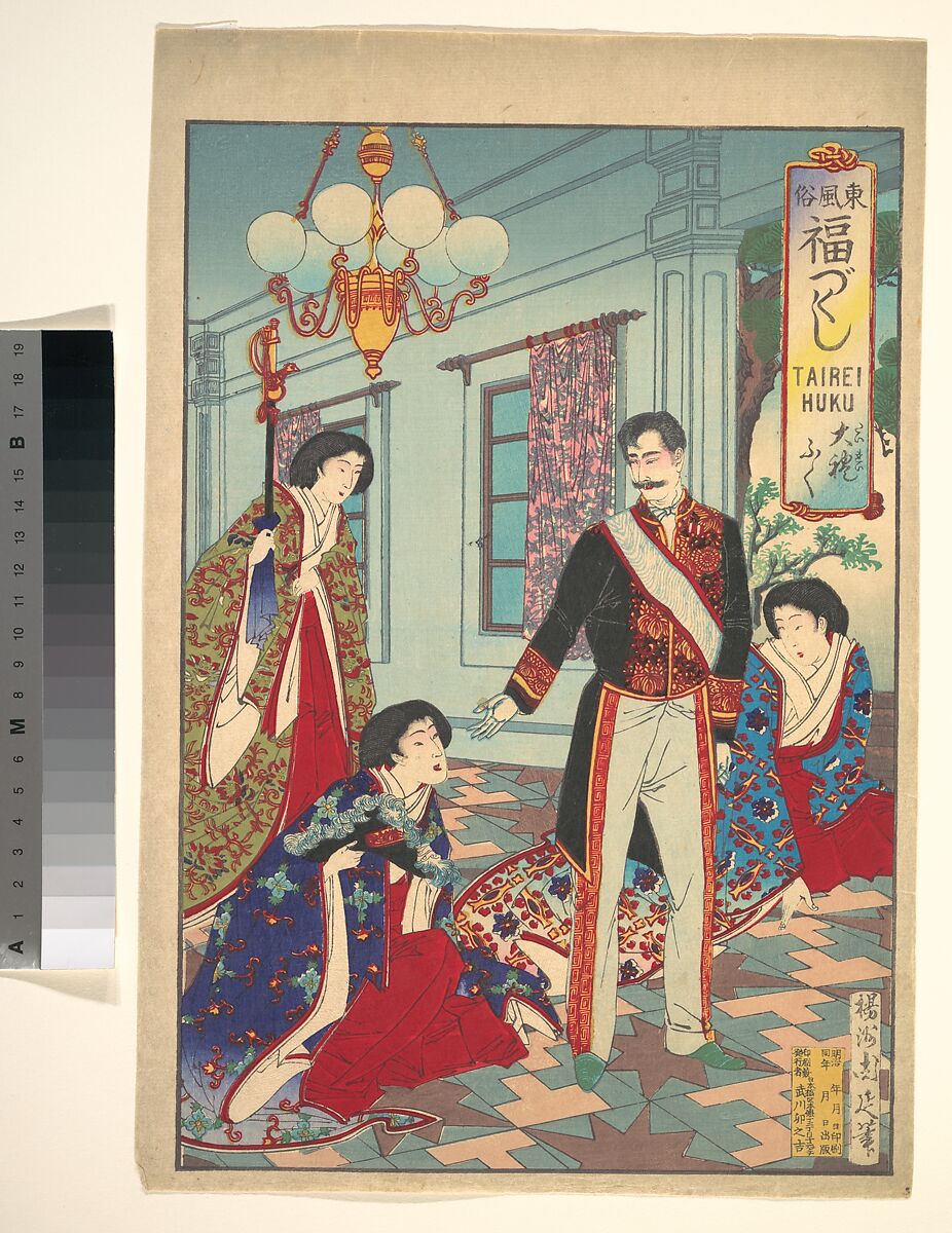 A Meiji government official dressed in a Western-style military uniform receives his cockaded hat from a female attendant, while another holds his European-style sword. The group stands in a Western-style building, probably the home of this modern man, but the women still wear traditional hakama (culottes) and robes. The word fuku in the print’s title is a pun: it can mean “auspicious” and “clothing.”