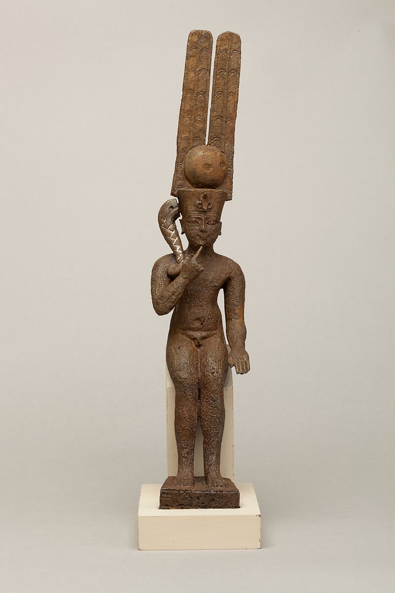 Child gods grew in popularity and cult from the Third Intermediate Period onwards, rivaling even the most powerful and ancient gods, especially as temple offerings. Because of their profusion and many local forms, generally it is very difficult to assign precise identities to child gods, but an inscription on the base names this figure as Harpokrates. Horus the child (or Harpokrates) is best known as the son of Osiris and Isis, but in some cases, such as this one and 25.184.19, he is also referred to as the son of Amun. Such multi-layered associations are common to Egyptian religion, which had no strict canon perse and which, by this point in time, was built upon millennia of change and adaptation.